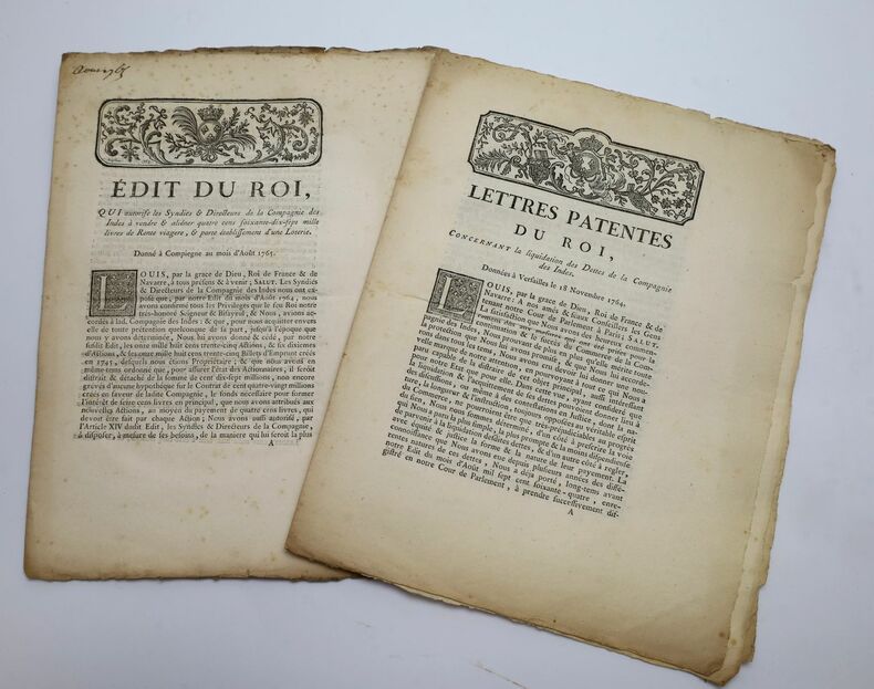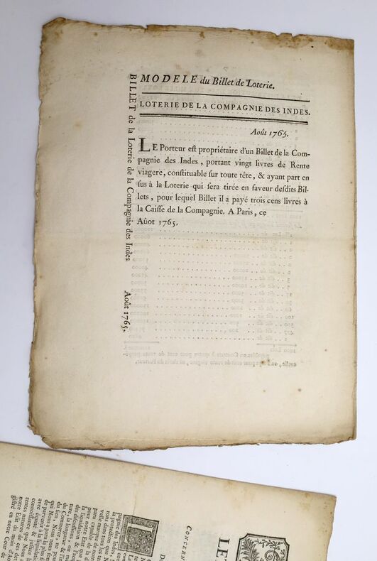 Paris, P.G. Simon, 1764-1764, in-4, 2 fascicules brochés, Non reliés, non assemblés, Actes visant à redresser la situation commerciale de la Compagnie orientales des Indes, après la perte par la France de son premier empire colonial et de la plupart de ses comptoirs. Ils sont un prélude à la suspension du monopole de la compagnie : - Lettres-patentes du roi, concertant la liquidation des dettes de la compagnie des Indes, données à Versailles le 18 novembre 1764. 7 pp. - Édit du roi, qui autorise les syndics & directeurs de la Compagnie des Indes à vendre & aliéner quatre cens soixante-dix-sept mille livres de rente viagères, & porte établissement d'une loterie. Donné à Compiègne au mois d'août 1765. 8 pp. Modèle de billet de loterie in fine. Bel état. Tels que parus. Wroth & Annan, Acts of French Royal Administration, n° 1661 et 1690. Couverture rigide