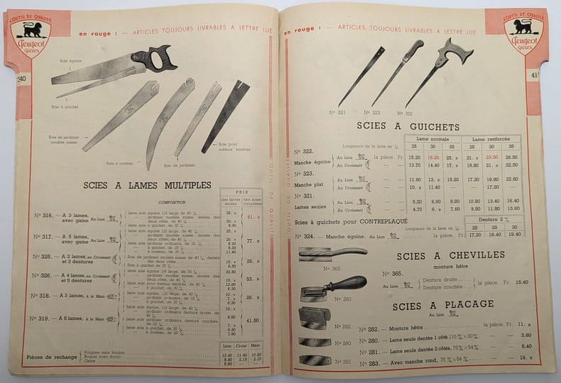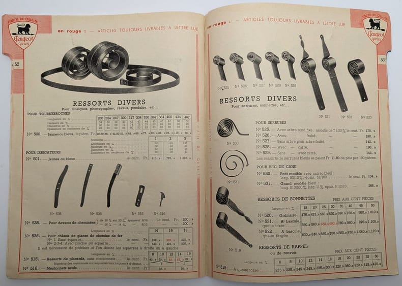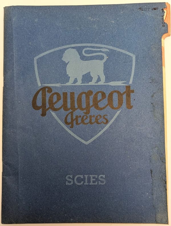 Valentigney, Peugeot, juillet 1938, in-4, 59 pp, Broché, couverture originale illustrée, Catalogue de scies produites par la société Peugeot frères imprimé et illustré en rouge et noir de reproductions représentant des scies, ressorts et racloirs. Petits manques et déchirures, quelques taches principalement à la couverture. Couverture rigide