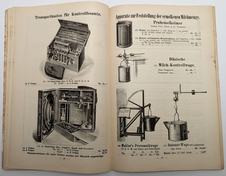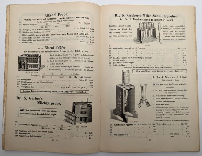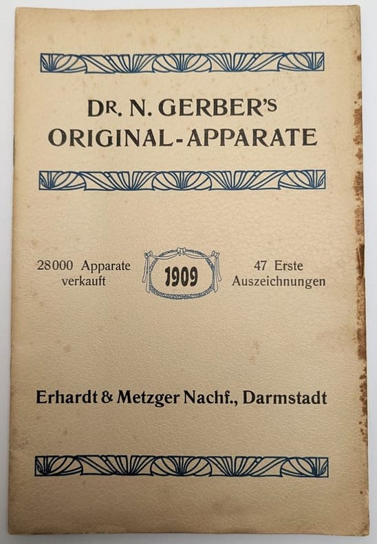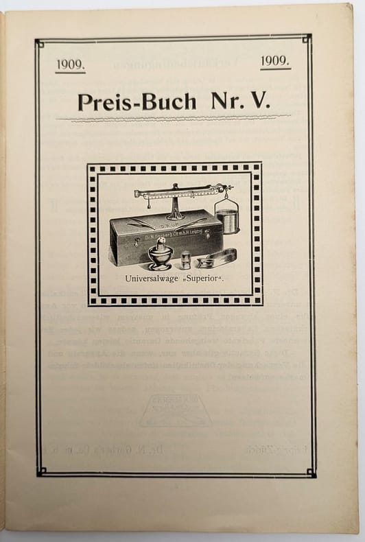 Darmstadt, Erhardt & Metzeger Nachf, 1909, in-8, 48 pp, Broché, couverture originale imprimée, Catalogue en allemand de matériel médical illustré de nombreuses vignettes en noir représentant des centrifugeuses, stérilisateurs, thermomètres et autres appareils de chimie médicale. Quelques petites taches marginales. Couverture rigide