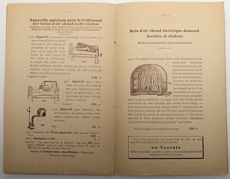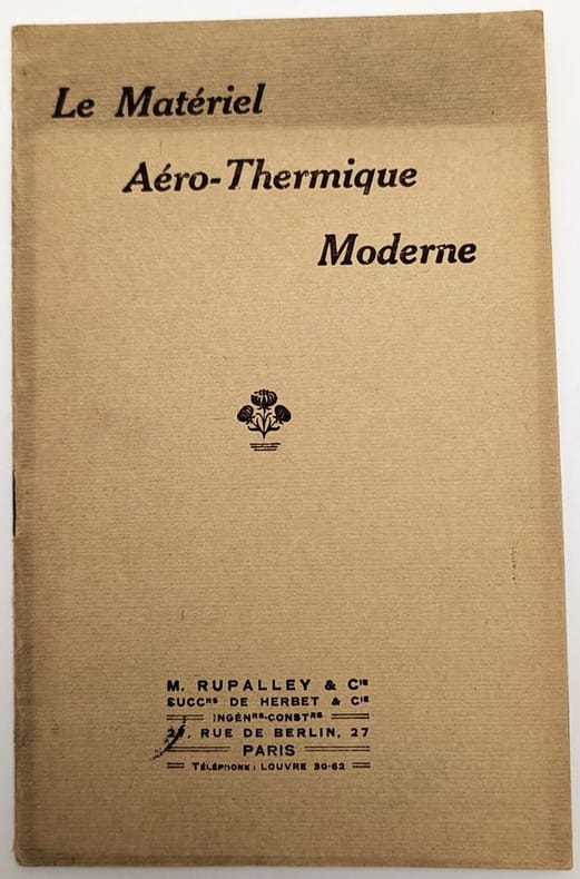 Paris, M. Rupalley & Cie, [début XXe siècle], in-8, 12 pp, Broché, couverture originale imprimée, Catalogue d'appareils d'aéro-thermothérapie (destinés à produire de la chaleur) illustrée de reproductions en bistre. Couverture empoussiérée dans les marges, quelques taches. Couverture rigide
