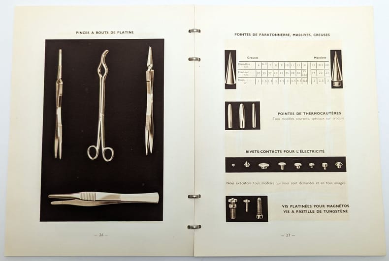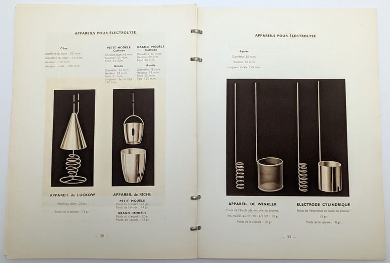 Paris, La Société nouvelle du comptoir Lyon-Alemand, [vers 1936], in-8, 39 pp, reliure à anneaux métalliques, couverture argentée et gaufrée, Catalogue joliment illustré en noir de chaudronnerie platine vendant creusets, paratonnerres et appareils pour analyses électrolytiques. Premier plat presque débroché, taches à la couverture. Couverture rigide