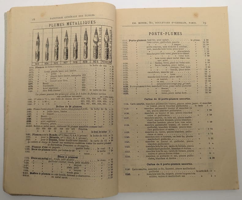 Paris, E.M. Royer, s.d, in-8, 128 pp, Broché, couverture originale imprimée, Catalogue de fournitures scolaires et papeterie comportant quelques illustrations en noir. Quelques rousseurs, déchirure en queue de dos. Couverture rigide