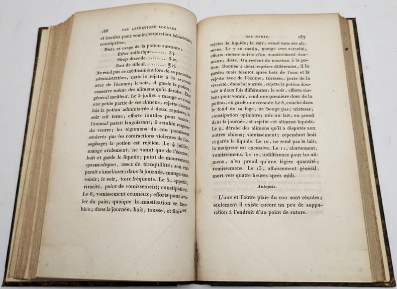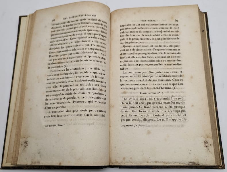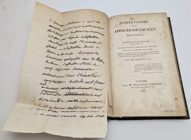 Paris, chez Mlle Delaunay, 1825, in-8, [8]-335 pp, 1 pl. depl. en front, Demi-toile postérieure à la bradel, Seconde édition de la thèse de doctorat très remarquée de Pierre-Jules Descot (décédé vers 1840), soutenue en 1822. Elle comporte en frontispice un fac-similé de page manuscrite par Pierre-Augustin Béclard, ainsi placé par l'auteur en hommage à son maître, tout juste décédé. À la suite de la préface est reproduit le discours funèbre prononcé par Descot. Cachet de l'Institut catholique de Paris et étiquette en pied du dos. Auréole sombre en pied des derniers feuillets, rousseurs. Dechambre, Dictionnaire encyclopédique des sciences médicales, série 1 , tome 28, p. 287. Couverture rigide