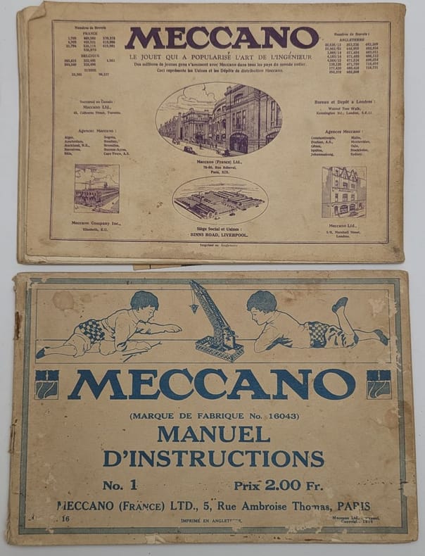 Paris, Meccano, 1916 et s.d, in-8, 112 + 136 pp, Brochés, oblong, couvertures illustrées en couleurs, Un lot de 2 Manuels d'instructions, l'un pour "L'emploi des boîtes Nos. 00 à 3", illustré en noir. Et l'autre "Manuel d'instruction, No.1", illustré en bleu. Couvertures défraîchies. Couverture rigide