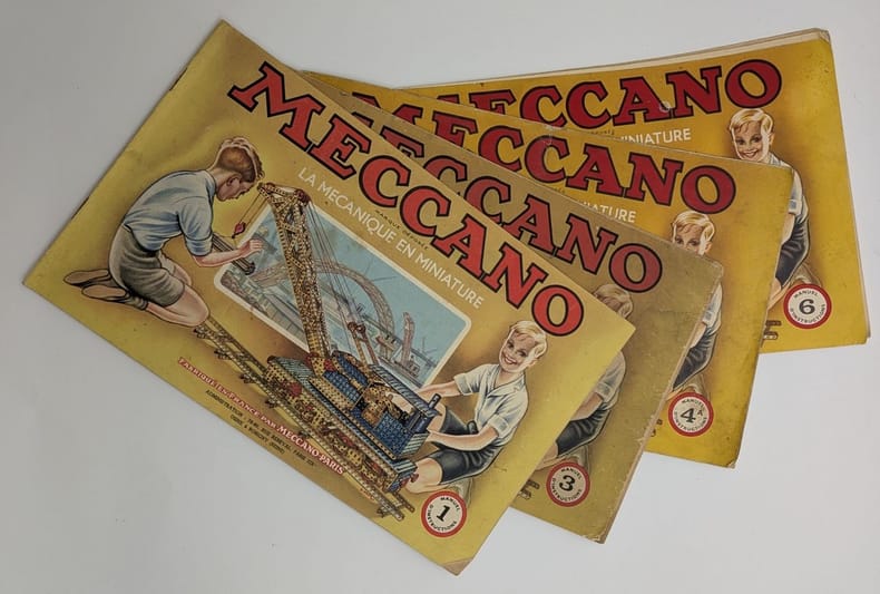 Bobigny, Meccano, 1948-1953, in-4, 20 + 20 + 40 + 88 pp, Brochés, oblong, couvertures illustrées en couleurs, Un lot de 4 manuels d'instruction illustrés en noir, sur la fabrication des maquettes, destinés aux enfants. L'ensemble est légèrement défraîchis, dont quelques accrocs et taches aux couvertures. Couverture rigide