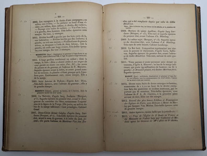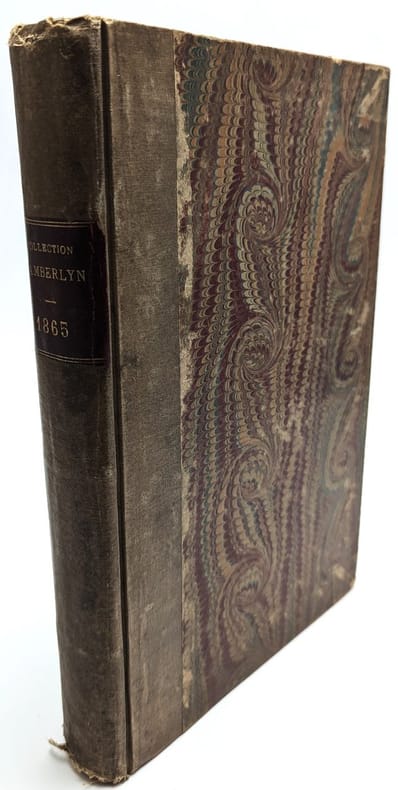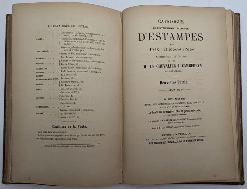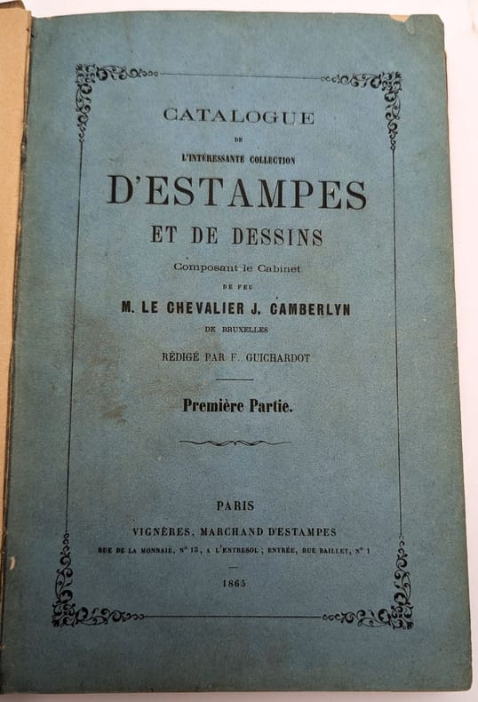 Paris, Vignères, marchand d'estampes, 1865, in-8, 230 pp, Demi bradel, pièce de titre rouge à titre doré. Couverture d'origine conservée, Catalogue divisée en deux parties de la collection Camberlyn d'estampes et de dessins. Annotations(Prix) au crayon à papier dans le texte, accrocs aux coins, aux plats de couverture et au dos. Couverture rigide