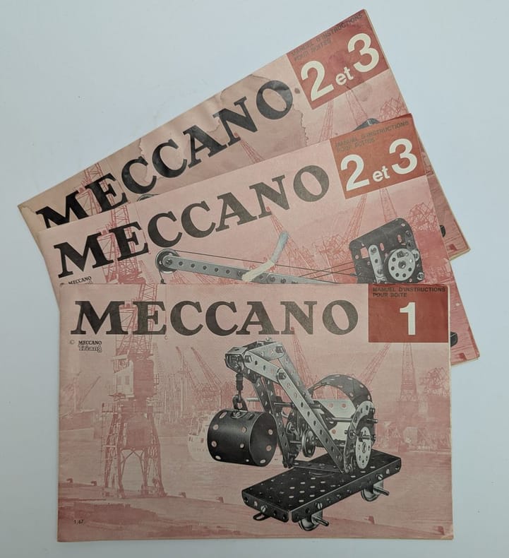 Bobigny, Meccano, s.d ( vers 1960), in-4, 24 + 12 + 24 pp, Brochés, oblong, couvertures roses illustrées en noir, Un lot de 3 manuels d'instructions pour les boîtes 1, 2 et 3, illustrés en couleurs. L'ensemble est en assez bon état, légères taches aux couvertures. Couverture rigide