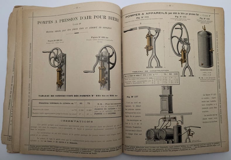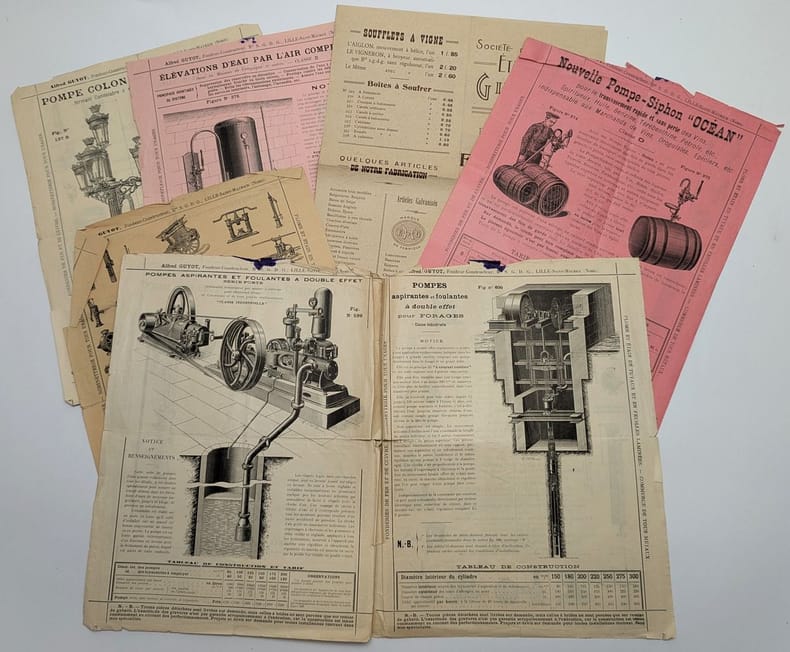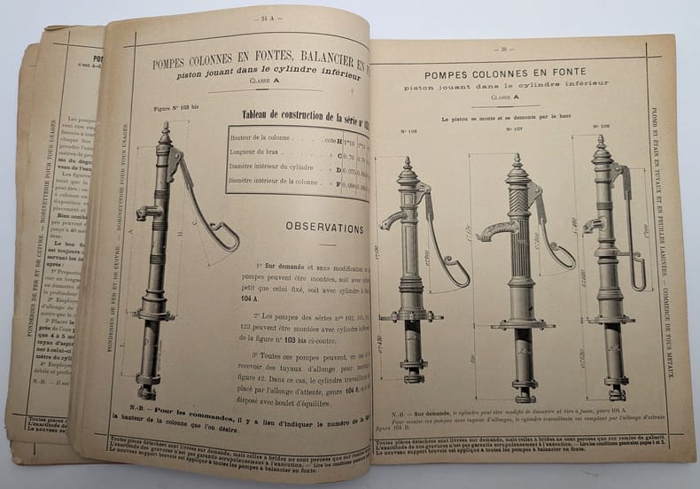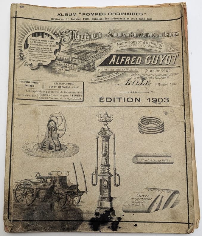 Lille, Alfred Guyot, 1903, in-4, 108 pp, Broché, couverture grise illustrée en noir, Catalogue illustré en noir et en jaune de modèles de pompes proposées par cette manufacture & fonderies de cuivre et de bronze : pompes à pression pour spiritueux et bières, pompes à piston, pompes colonnes en fonte pour espaces publics, pompes aspirantes et foulantes, pompes pour puits profonds, etc. Alfred Guyot, fondeur-constructeur, breveté S.G.D.G. dont la maison spécialisée en robinetterie générale était installée à Lille. Exemplaire truffé de quelques prospectus sur des modèles spécifiques de pompes. Couvertures salies, premières pages détachées. Couverture rigide