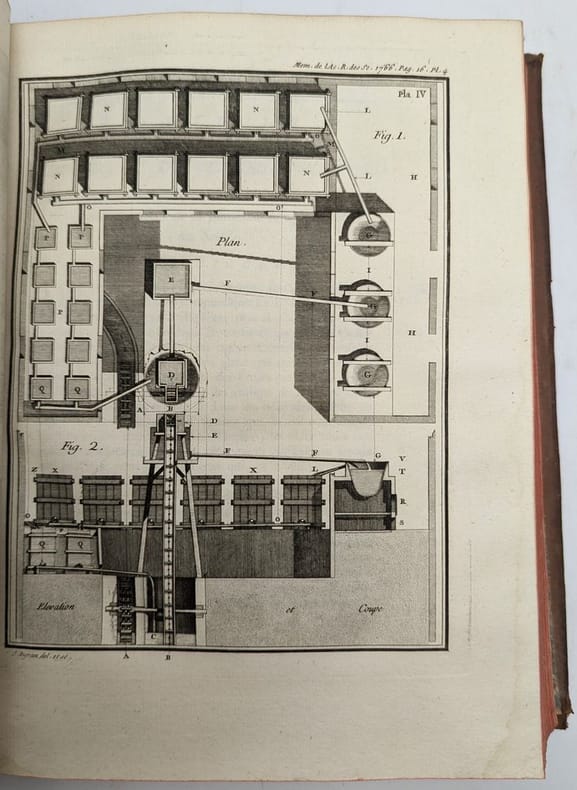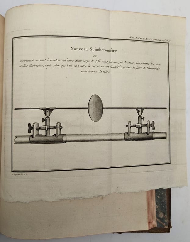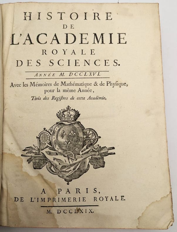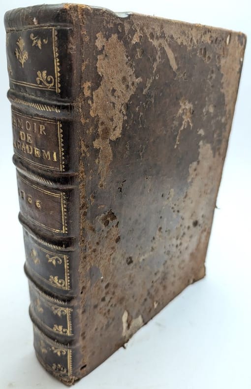 Paris, Imprimerie Royale, 1769, in-4, 179-611 pp. 22 pl. 2 pl. dépliantes, Basane marbrée havane, dos à nerfs fleuronnés, pièce de titre brune, Ensemble des mémoires de mathématiques de physique pour l'année 1766, illustré de 2 planches dont 2 dépliantes et comprenant : Mémoire sur les Aluminières, Alumières ou Alunières de la Tolfa, aux environs de Civita-Vecchia. Par M. FOUGEROUX DE BONDAROY Recherches sur la longitude de plusieurs Villes, accompagnées de quelques Réflexions sur les nouvelles déterminations de la parallaxe horizontale du Soleil. Par M. PINGRÉ Sur le Vésuve. Par M. FOUGEROUX DE BONDAROY Second Mémoire pour la détermination des Principaux Elémens de la théorie de Jupiter. Pax M. JEAURAT Observation de l'Éclipse partiale du Soleil, du 5 Août 1766. Par M. DE FOUCHY Mémoire sur l'inflammation des Viscères du bas-ventre, particulièrement sur celle du foie, toujours suivie d'une mauvaise santé qui produit une bonne partie des douleurs qu'on attribue faussement à l'estomac , sous le nom de Cardialgie, ou autre, Par M. FERREIN Mémoire sur les différentes méthodes qui ont été employées pour fonder les ouvrages de Maçonnerie dans l'eau, & principalement sur celles qui tendent à supprimer les batardeaux & épuisemens dans la construction des Ponts. Par M. PERRONET. Second Mémoire sur le projet d'amener à Paris la rivière d'Yvette, dans lequel on constate que cette eau est très-salubre & de la meilleure qualité, suivant les expériences faites par les Commissaires de la Faculté de Médecine. Par M. DEPARCIEUX Nouvelles Méthodes analytiques pour calculer les Eclipses de Soleil, &c. Quatrième Mémoire, dans lequel on applique à la solution de plusieurs Problèmes astronomiques , les équations démontrées dans les premiers Mémoires. Par M. DU SÉJOUR Mémoire sur le Sac nasal ou lacrymal de plusieurs espèces d'Animaux. Par M. BERTIN Mémoire sur le Giallolino ou Jaune de Naples. Par M.FOUGEROUX DE BONDAROY Histoire d'une Maladie très-singulière, arrivée à deux Bouchers de l'Hôtel royal des Invalides. Par M. MORAND Application curieuse de quelques phénomènes d'Électricité, Pax M. l'Abbé NOLLET Réflexions sur l'Éclipse de Lune du 24 Février 1766. Pa M.LE MONNIER Mémoire sur un Insecte de Cayenne, appelé maréchal, & sur la lumière qu'il donne, Pax M. FOUGEROUX DE BONDAROY Mémoire sur le mouvement des Noeuds, & sur la variarion de l'inclinaison des Satellites de Jupiter. Par M. BAILLY Expériences sur le Borax. Par M. CADET Mémoire sur l'état actuel de l'entreprise pour la rectification des Cartes marines de la Méditerranée , & pour la formation d'un second volume du Neptune François; avec la description d'un nouveau moyen d'établir promptement dans sa vraie direction l'instrument des Passages au Méridien pendant les voyages astronomiques par mer. Par M. DE CHABERT Observation de l'Éclipse de Soleil du 5 Août 1766, faite à Colombes dans un Observatoire, qui est 20"1/3 de temps à l'occident de l'Observatoire royal; sa latitude étant de 48d 55' 28". Par M. le Marquis DE COURTANVAUX Observation de l'Éclipse du Soleil du 5 Août 1766, faite au château de Belle-vue, en présence du Roi, Par M. LE MONNIER Observation de l'Éclipse de Soleil du 5 Août 1766. Par M.MARALDI Observation de l'Éclipse de Soleil du 5 Août 1766, faite à l'Observatoire de l'hôtel de Cluni. Par M. PINGRÉ Observation de l'Eclipse de Soleil du 5 Août 1766. Par M. l'Abbé CHAPPE D'AUTEROCHE Observation & calcul de l'Éclipse du 5 Août 1766. Par M. JEAURAT Observation de l'Éclipse de Soleil du 5 Août 1766. Par M. CASSINI DE THURY Observation & calcul de l'Émersion de l'étoile [delta] du Capricorne par la Lune, du 25 Septembre 1765. Par M. JEAURAT Mémoire sur la première Comète de cette année. Par M. PINGRÉ. Réflexions sur quelques nouveaux phénomènes d'Hydrostatique. Par M. l'Abbé NOLLET Sur la Théorie de Mercure. Premier Mémoire, Couverture rigide