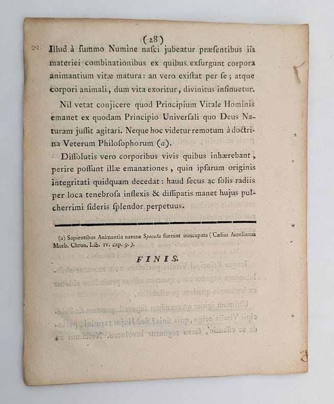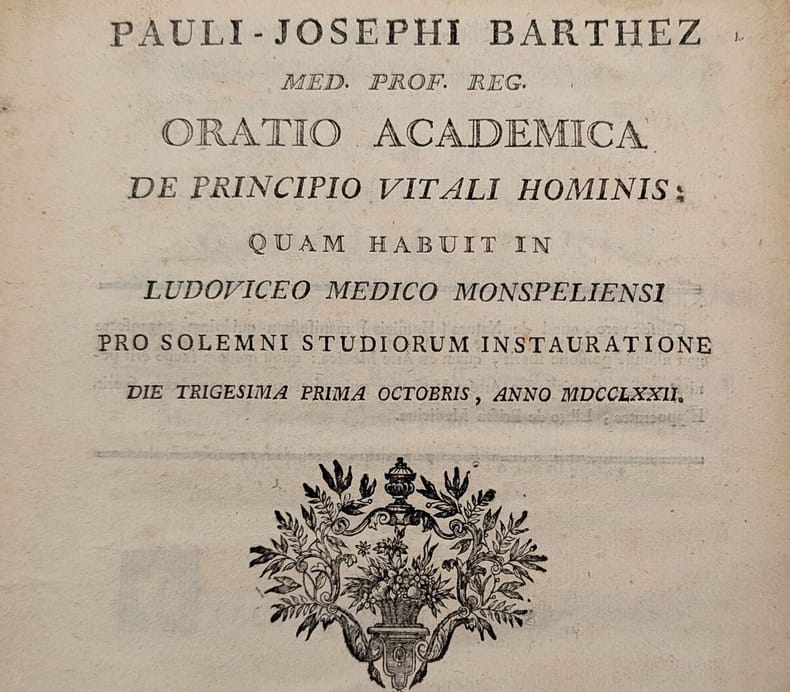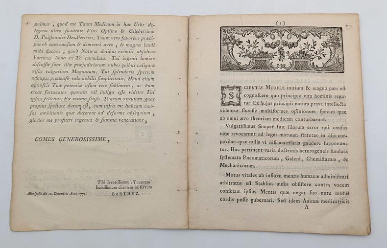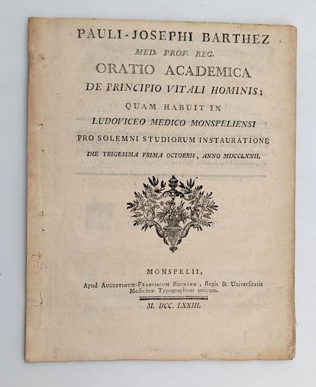 Montpellier, A.-Fr. Rochard, 1773, in-4, [4]-28 pp, Broché, sans couverture, Rare édition originale du discours de Paul Joseph Barthez (1734-1806), prononcé lors de la rentrée de l'École de médecine de Montpellier le 31 octobre 1772. Il s'agit du premier écrit dans lequel l'auteur expose la doctrine du "vitalisme" qui le rendit célèbre. Cette plaquette précède en effet la Nova doctrina de funcionibus naturae humana et les Nouveaux éléments de la science de l'homme, qui paraitront respectivement en 1774 et en 1778. Barthez définit ce principe, qui découle de l'animisme de Georg Ernst Stahl, comme la base du phénomène de la vie : toute anomalie de ce fonctionnement constituerait ainsi une maladie. Barthez, professeur d'anatomie, de médecine et de botanique, encyclopédiste et médecin consultant de Napoléon, était adepte de la médecine humorale. Ses écrits sont peu courants : la plupart, publiés au lendemain de la Révolution, comprennent des observations médicales, philosophiques et physiologiques, tandis que ses cours sont restés inédits de son vivant. Débroché. En l'état. Blake p.32. Couverture rigide