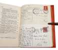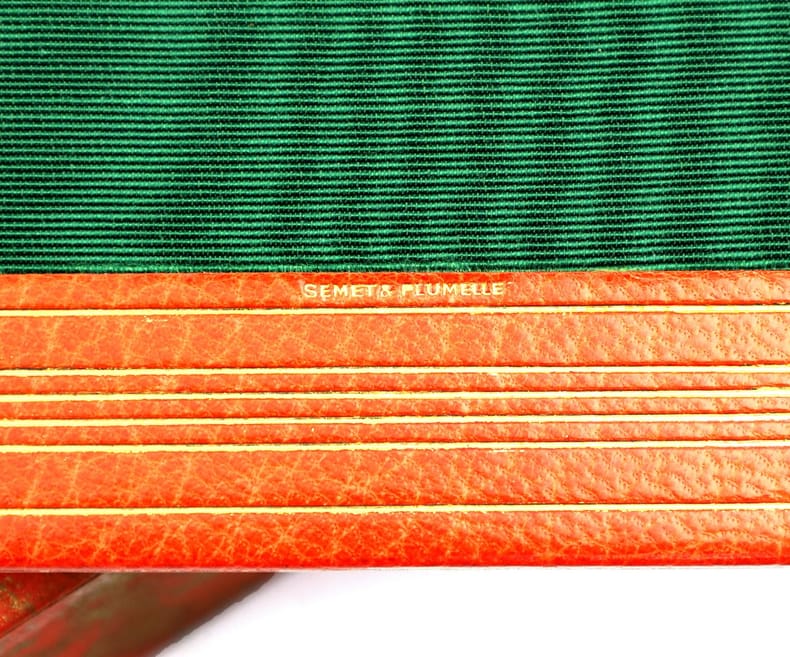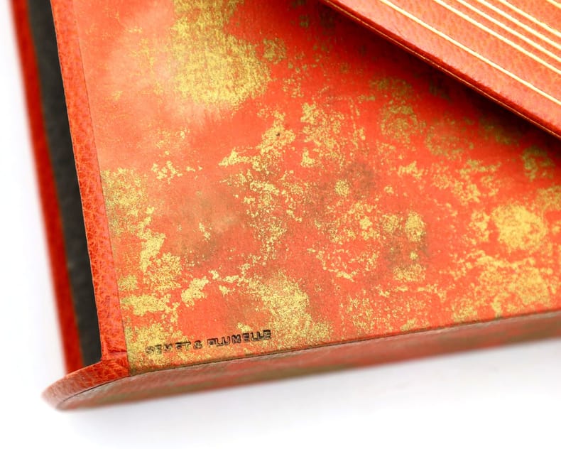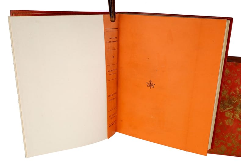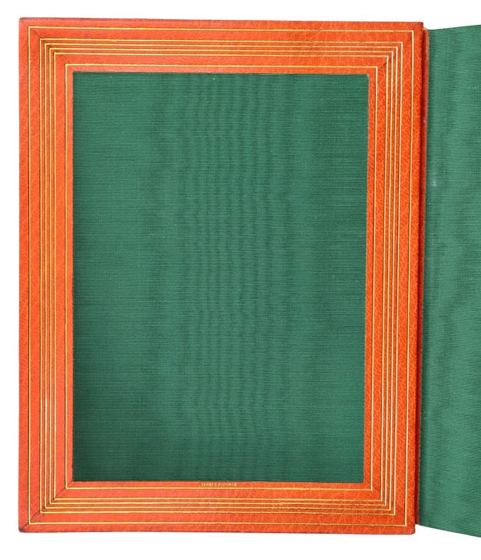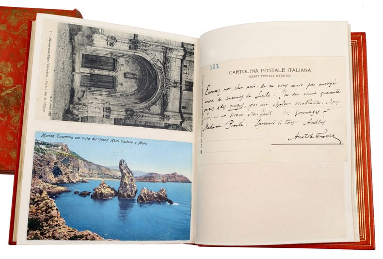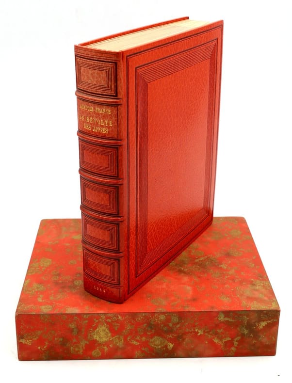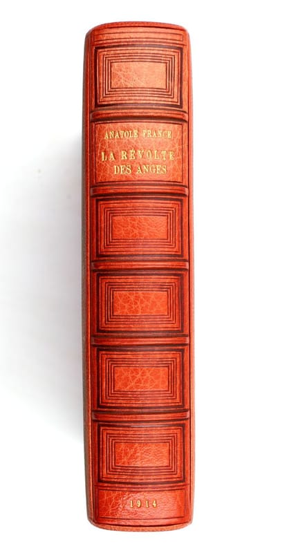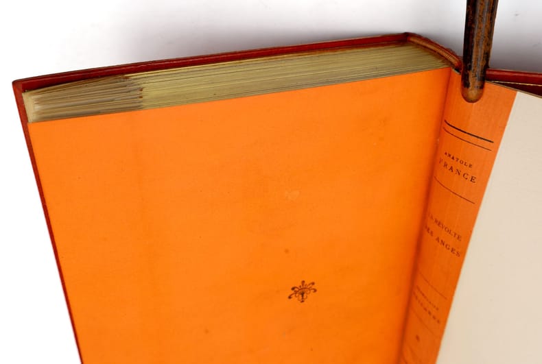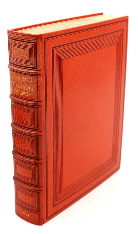 Paris, Calmann-Lévy, 1914, in-8, 416 pp, Maroquin orange, filets à froid en encadrement sur les plats, dos à nerfs orné de même, bordure intérieure ornée de filets dorés, garde et doublure de soie moirée verte, tranches dorées sur témoins, couverture conservée, étui bordé [Semet et Plumelle], Exceptionnel exemplaire de l'édition originale de ce roman d'Anatole France : Un des 200 exemplaires numérotés sur Hollande, celui-ci comportant un bel envoi autographe signé au marchand d'estampes Victor Prouté (1854-1918), ami d'Anatole France, chez qui il achetait des gravures. Il est en outre truffé de 3 cartes postales autographes signées d'Anatole France au même, datées respectivement d'Houlgate en avril 1910, de Taormine en avril 1913 et de Palerme en mars 1913 : La deuxième carte évoque la rédaction de la Révolte des anges alors que l'auteur est en Sicile "par une chaleur accablante". La dernière contient les remerciements d'Anatole France à Prouté pour l'appréciation de son livre. Il en est d'autant plus ravi que ce roman, dont l'action se déroule sous la Troisième République, est une critique acerbe de cette société à la veille de la Première Guerre mondiale et qu'Anatole France sait que ses "Anges [...] ne seront pas agréables à tout le monde". Superbe exemplaire, truffé et à toutes marges, parfaitement établi dans un maroquin signé de Semet et Plumelle. Couverture rigide