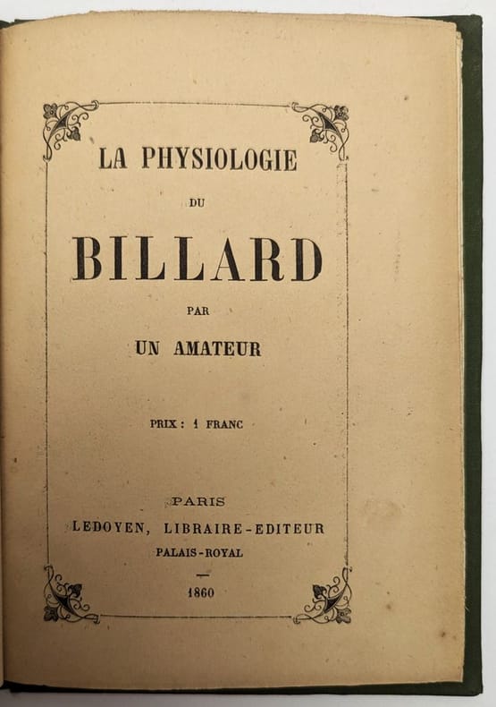 Paris, Ledoyen, 1860, in-16, 64 pp, Broché, couvertures imprimées de l'éditeur, Édition originale de ce petit opuscule, très rare, consacré à ce jeu qui aurait été créé en France et dont le premier modèle connu fut fabriqué par l'ébéniste Henri de Vigne pour le roi Louis XI. L'auteur étudie le billard sous les angles les plus divers : sociologie du joueur, son histoire et son évolution, ses maîtres et les instruments nécessaires à ce jeu. Rare. Exemplaire tel que paru, broché et non coupé. Petite déchirure sur la page de faux-titre, insolation sur les premier et dernier feuillets. Lhéritier n°202. Vicaire VI, 628. Couverture rigide
