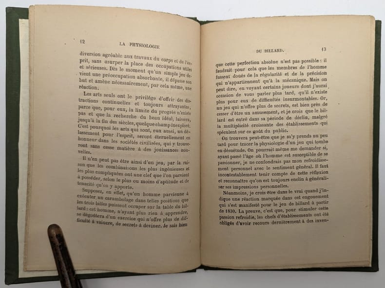 Paris, Ledoyen, libraire-éditeur, 1860, in-16, 64 pp, Toile verte à la bradel, pièce de titre en long, couverture conservée, Édition originale de ce petit opuscule très rare, consacré à ce jeu qui aurait été créé en France et dont le premier modèle connu fut fabriqué par l'ébéniste Henri de Vigne pour le roi Louis XI. L'auteur étudie le billard sous les angles les plus divers : sociologie du joueur, son histoire et son évolution, ses maîtres et les instruments nécessaires à ce jeu. Minuscules épidermures à la pièce de titre, quelques petites taches ou rousseurs éparses. Lhéritier 202. Vicaire, VI, 628. Couverture rigide