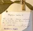 Paris, Institut Catholique, c. 1811-1955, in-folio, environ 1000 spécimens botaniques, 9 portefeuilles à rubans, Ensemble de neuf portefeuilles, contenant des liasses de 100 à 120 feuilles volantes chacune - certaines sous feuille doublée : soit environ 1000 spécimens botaniques. Chaque feuille comporte 1, 2, 3 voire 5 à 10 spécimens, venus du monde entier : France, Algérie, Baléares, Allemagne, Guadeloupe, Laponie, Bolivie, Inde, Mauritanie, Côte d'Ivoire, etc. Les plantes sont réunies par famille et désignées selon des nomenclatures anciennes et la classification de Linné - ou d'autres botanistes - parfois mises à jour ultérieurement au crayon. Les étiquettes donnent en outre les noms des herborisateurs, éventuellement les "missions botaniques" au cours desquelles les spécimens ont été récoltés, les noms vernaculaires, des informations diverses sur les types de terrain, etc... Enfin, chaque feuille porte une étiquette secondaire indiquant "Herb. Univ. Cath. Paris." : il s'agit en effet d'une part de l'herbier constitué pour l'Institut catholique de Paris et qui faisait partie d'une collection beaucoup plus vaste, comportant au moins 15 000 spécimens dans les années 1870 (Péchenard). L'ouvrage est dû à plusieurs contributeurs, récolteurs, collecteurs, collectionneurs de France et d'Europe, entre la deuxième moitié du XIXe siècle et le début du XXe siècle : en tout, environ 74 botanistes sont cités, dont : Paul Émile Botta (1802-1870), archéologue et consul, surtout connu pour ses découvertes archéologiques en Mésopotamie, notamment le palais de Sargon II à Khorsabad; Eugène Bourgeau (1813-1877), botaniste qui a participé à des expéditions, notamment en Amérique du Nord; Ernest Cosson (1819-1889), dont les travaux ont contribué de manière significative à la connaissance de la flore d'Afrique du Nord; Théodore von Heldreich (1822-1902), directeur du Jardin botanique national d'Athènes; Henri de la Perraudière (1831-1861), connu pour son voyage botanique aux Canaries; Louis Charles Trabut (1853-1929), qui a étudié la flore d'Algérie et les plantes médicinales; ou encore Friedrich Welwitsch (1806-1872), botaniste autrichien qui a exploré la flore d'Angola et qui a laissé son nom à la Welwitschia mirabilis. Dès sa fondation en 1875 par Maurice d'Hulst (1841-1896), l'Institut Catholique se dote d'une chaire de botanique et établit un jardin botanique dans le jardin des Carmes. Les premiers professeurs, l'abbé Conil et le docteur Édouard Tison, enrichissent les collections d'étude. Plusieurs donateurs, dont l'abbé Jourdan et Mme Shuttleword, offrent des herbiers et des collections de plantes. Enfin, le docteur Tison transforme le jardin en un espace botanique riche de 2223 espèces de plantes. Pourtant, le nombre de candidats aux cours de botanique reste faible. La chaire de botanique est supprimée en 1880, au nom de la loi réservant la délivrance des diplômes de sciences naturelles aux établissements publics. Une tentative de rétablir les cours en 1886 échoue, puis, en 1891, le jardin est remplacé par des cultures maraîchères. La botanique fait ainsi l'objet d'un enseignement complémentaire, dans lequel l'abbé Jean Augier (1909-1997) joue un rôle majeur, grâce à sa contribution sur l'étude des algues rouges et des mousses. La matière ne figure aujourd'hui plus au programme de l'Institut. Herbier en ordre et en très bon état général de conservation. Les spécimens sont fixés et globalement bien renseignés. Ils sont classés par famille. Certains sont identifiés de façon incomplète ou illisibles. Quelques feuilles ont perdu les rubans servant à fixer les spécimens. Quelques mouillures. Petites déchirures et pliures en bord et marge de quelques feuilles. Les étiquettes de repérage des familles en bordures sont parfois abîmées. P.-L. Péchenard, L'Institut catholique de Paris, 1875-1901, 1902, Ch. Poussièlgue, p.183. Nos Couverture rigide