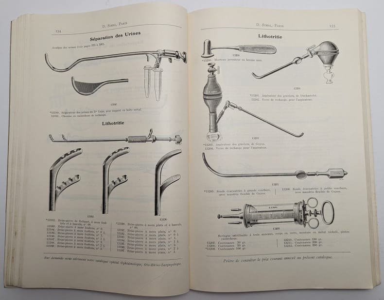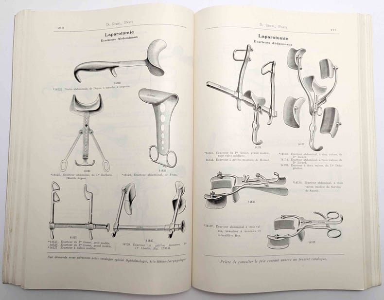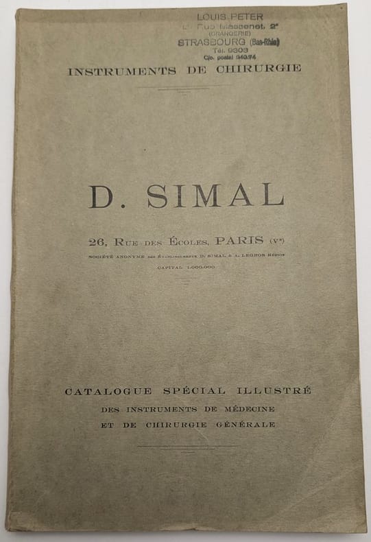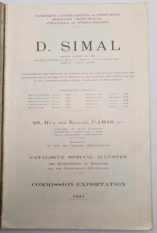 Paris, Simal, 1933, in-8, 428 pp, Broché, couverture originale imprimée, Catalogue de matériel médical illustré en noir. On joint le prix courant, de 57pp. d'avril 1935. Quelques petites taches. Couverture rigide