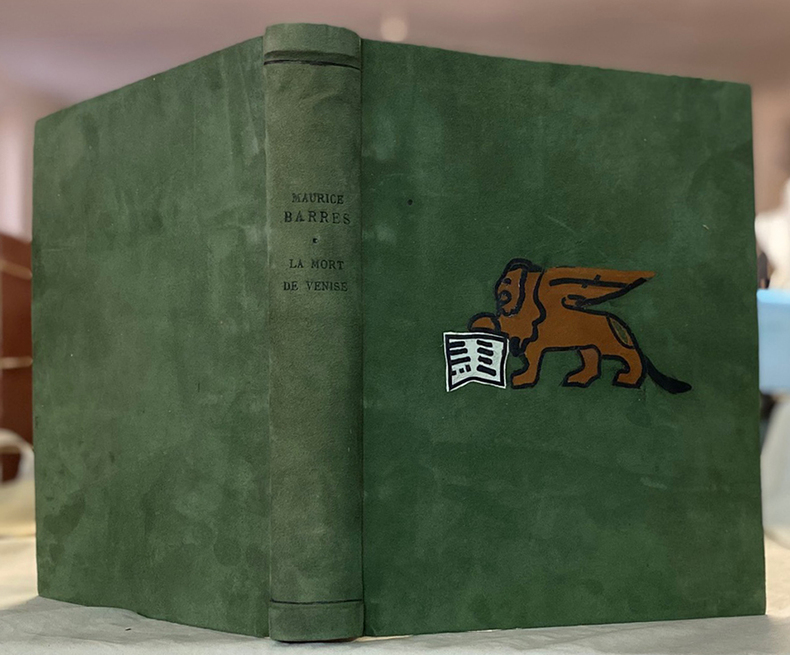 P. Editions René Kieffer 1920. Grand in-8° pleine suédine verte, dos à larges faux nerfs, titre frappé à froid, premier plat mosaïqué aux armes de la ville de Venise stylisées, couverture et dos conservés.
