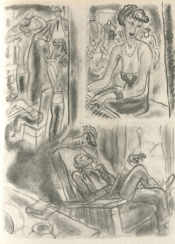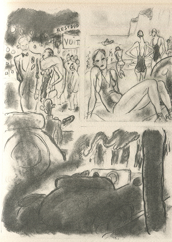 Maquette typographique présentant les couvertures, le faux-titre au dos duquel est contrecollée la justification illustrée d’un bois, avec des indications manuscrites, deux essais de pages de titre tirées en rouge, puis le texte imprimé et contrecollé sur des feuillets blancs présentant deux numérotations différentes.Nombreuses indications dans les marges, corrections dans le texte, surlignage de certains passages en vert.Les espaces pour les hors-texte ont été laissés vacants. Les culs-de-lampe ont été indiqués au crayon vert : 17 gribouillis indicatifs ou croquis plus précis (vélo, fumeur, deux drapeaux croisés, automobile, skieur, tombe…). Tout porte à croire qu’ils sont de la main de Gus Bofa. Dernier cul-de-lampe imprimé et contrecollé.On trouve ensuite diverses pages du texte imprimé illustré de six eaux-fortes dont deux répétées. Les pages sont en deux états en noir et avec le titre contrecollé et tiré en vert, de même pour les filets typographiques en haut du texte.
