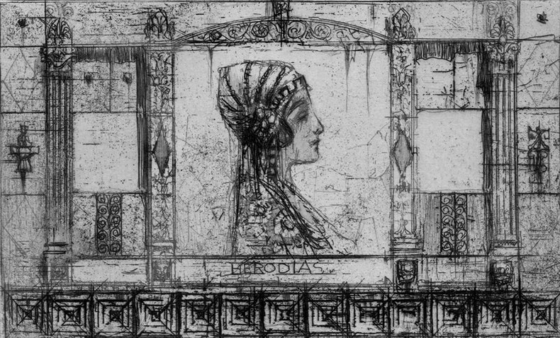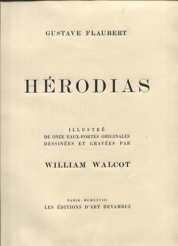 Gustave FLAUBERT, Hérodias, illustré par les eaux-fortes de William Walcot à Paris, éditions d'Art Devambez, 1928. In-quarto sous étui et chemise cartonnée demi-basane havane (325x260mm) avec titres dorés au dos, chemise rempliée, 54 pages en feuillets libres. Tirage numéroté 157/221, celui-ci un des 125 exemplaires tiré sur Vélin d'Arches, après 76 ex. sur papier Japon et avant 20 ex. réservés à l'artiste. Accompagné de 12 eaux-fortes originales gravées par William Walcot (1874-1943) dont 1 frontispice et 6 hors-textes. Aquarelliste de sites urbains, graveur et dessinateur, William Walcot a également illustré Salammbô. Afin de rédiger Hérodias, ce troisième des Trois Contes, Gustave Flaubert (1821-1880) s'est livré à un énorme travail de documentation, il paraîtra en avril 1877 dans le journal Le Moniteur. ''Lire et prendre des notes, c'est de la débauche'' écrira Flaubert dans une lettre à Mme Brainne le 17 octobre 1876. Étui en état moyen, des rousseurs éparses.