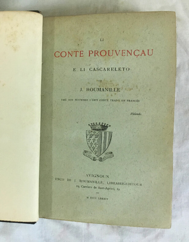 1ère édition (? parfois annoncée de 1883...) de ce recueil de contes (et "récits facétieux") en provençal de Joseph ROUMANILLE (1818-1891) avec traductions françaises d'un "bon nombre" d'entre eux (par Armand de PONTMARTIN, Alphonse DAUDET, Ed. LABOULAYE, P. YVAREN, Louis JOURDAN, Emile BLAVET, etc) en fin de volume, avec notices introductives. Exemplaire relié, avec dédicace manuscrite de l'auteur; à restaurer.