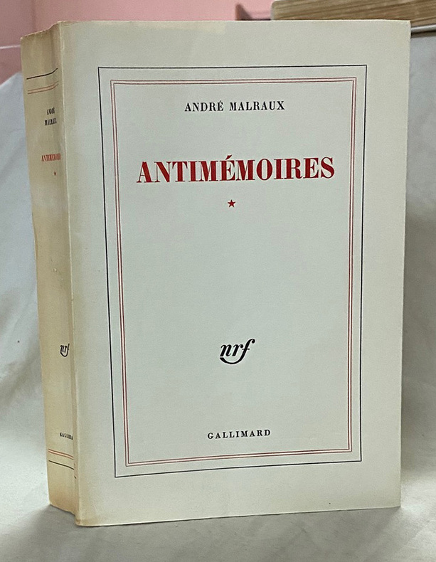 Paris, Gallimard, 1967. In-8 de 604 pp., (3) ff. Broché, partiellement non coupé, tel que paru. 206 x 139 mm. ÉDITION ORIGINALE. L’un des 80 exemplaires de tête sur vélin de Hollande (N°22). D’apparence récit autobiographique traditionnel, cette confession s’en éloigne pourtant en mêlant aux faits historiques de nombreux éléments de fiction, et en refusant la chronologie linéaire au profit d’une chronologie circulaire. Le fil rouge des Antimémoires est un voyage effectué par Malraux en 1965, qui le mène de l’Égypte à la Chine en passant par la péninsule arabique et l’Inde. Chaque escale évoque des voyages passés. Chaque souvenir en rappelle un autre, qui en rappelle un autre à son tour. Le livre s’interroge avant tout sur la nécessité du travail de mémoire. Il ne s’agit pas à proprement parler d’une autobiographie de l’auteur ; Antimémoires est plutôt une revue de son existence liée aux grands événements politiques et géopolitiques de son époque, où il évoque par ailleurs de nombreux auteurs qui ont marqué la vie sociale de leur empreinte. « Ni confessions, ni mémoires, mais inlassable interrogation d’une expérience toujours davantage transformée en conscience. Les Antimémoires, malgré leur pudeur, sont un autoportrait : celui d’un esprit génial et fraternel qui, en posant les vraies questions, progresse des « problèmes » aux « mystères », de Gide à Bernanos » (Nouveau dictionnaire des œuvres). L’un des tous premiers lecteurs de l’ouvrage, le général de Gaulle, télégraphia à Malraux « Livre admirable dans les trois dimensions ». BEL EXEMPLAIRE APPARTENANT AU TIRAGE DE TETE, CONSERVE BROCHE, TEL QUE PARU.