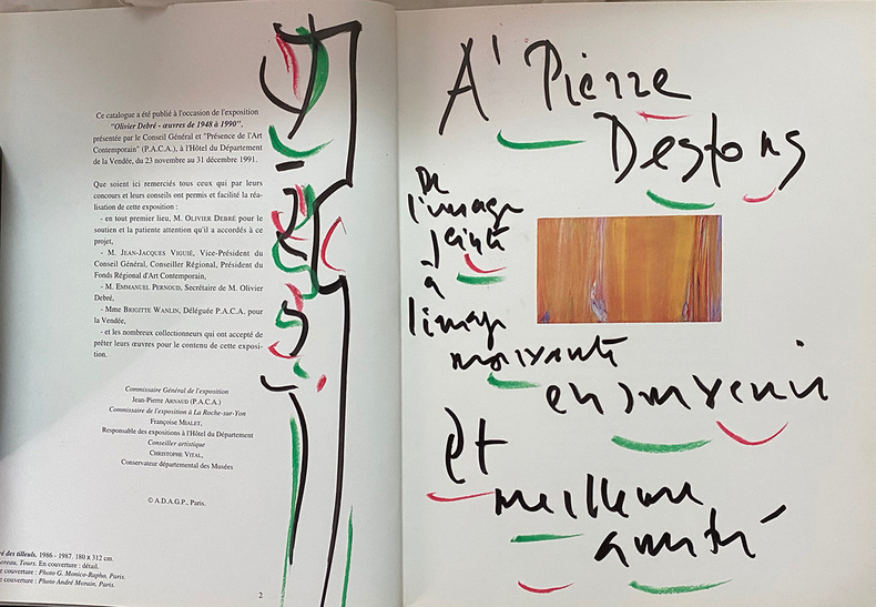 Catalogue de l’exposition “Olivier Debré Oeuvres de 1948 à 1990. Nombreuses reproductions en couleurs dans et H.T. Notre exemplaire est enrichi d’un envoi et d’un dessin original en couleurs adressé au cinéaste peintre Pierre DESFONS : A Pierre Desfons de l’image peinte à l’image mouvante en souvenir et mailleure amitié”.