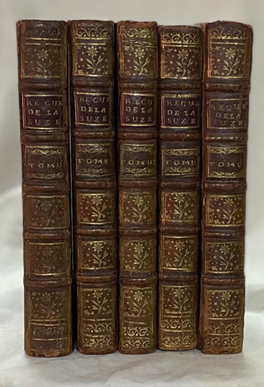 Nouvelle édition, considérablement augmentée de plusieurs volumes. Ces 5 volumes rassemblent les poésies en vers et en prose de la Comtesse de Suze et de Pelisson, mais également de nombreuses pièces qui leur ont été faussement attribuées, comme celles de Régnier des Marais, des pièces de Mademoiselle de Scudery, le voyage de Bachaumont et La Chappelle, les poésies du Chevalier d'Aceilly, Les Visionnaires, pièces de Jean Desmarets, mais également La princesse de Montpensier de la princesse de Clèves, déclarée anonyme, des lettres, plusieurs courtes nouvelles. Reliure en plein veau blond glacé d'époque. Dos lisse orné de 4 fers au soleil avec semi d'étoiles. Pièce de titre en maroquin rouge. Pièce de tomaison en veau blond. Dentelle d'encadrement sur les plats. Très bel exemplaire, dans une reliure fine et élégante. Riche anthologie de la littérature galante du XVIIe.Henriette de Coligny de La Suze fut au centre d'une société dédiée à la poésie et à la galanterie.Ninon de Lenclos,Christine de Suède,Madeleine de Scudérysont ses amies. Elle écrit, au milieu d'une vie de dissipation et de murs légères, au cours de laquelle elle eut à la fois une réputation de beauté, d'esprit et de talent. On pense qu'elle eut plusieurs collaborateurs, comme Segrais, Ménage ou Subligny. Elle fut surtout remarquable dans l'écriture de ses élégies qui lui donnent une place de choix dans la poésie du XVIIe. Paul Pellisson évoluait dans le cerlce de la Comtesse de Suze et fréquentait les mêmes personnes, secrétaire de Nicolas Fouquet et histoiographe du roi, il est lié avec tout le monde des lettres de cette époque (Bussy-Rabutin, Madame de Sévigné, Mademoiselle de Scudéry...) - Photographies et détails sur www.Edition-Originale.com -