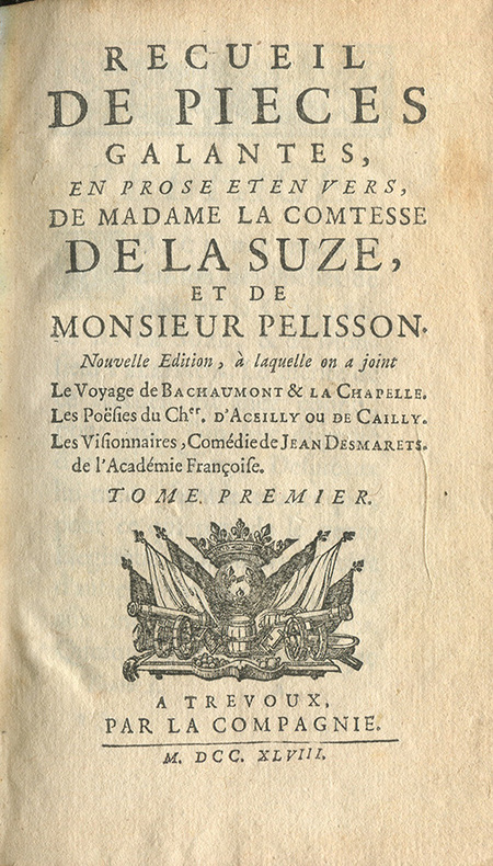 Nouvelle édition du fameux recueil La Suze-Pellisson, célèbre recueil collectif de poésies galantes publié pour la première fois en 1663. Il comprend plusieurs pièces en vers de Madame de La Suze, précieuse surnommée Doralise dans le Dictionnaire de Somaize, mais aussi de Pelisson-Fontanier, Charles Perrault, Bussy-Rabutin, Mlle de Scudéry, Madame de Lauvergne et plusieurs autres poètes de la seconde moitié du XVIIe siècle. Goujet XVII, 308; cat. Cluzel, Poètes anciens (1979), n°68.
