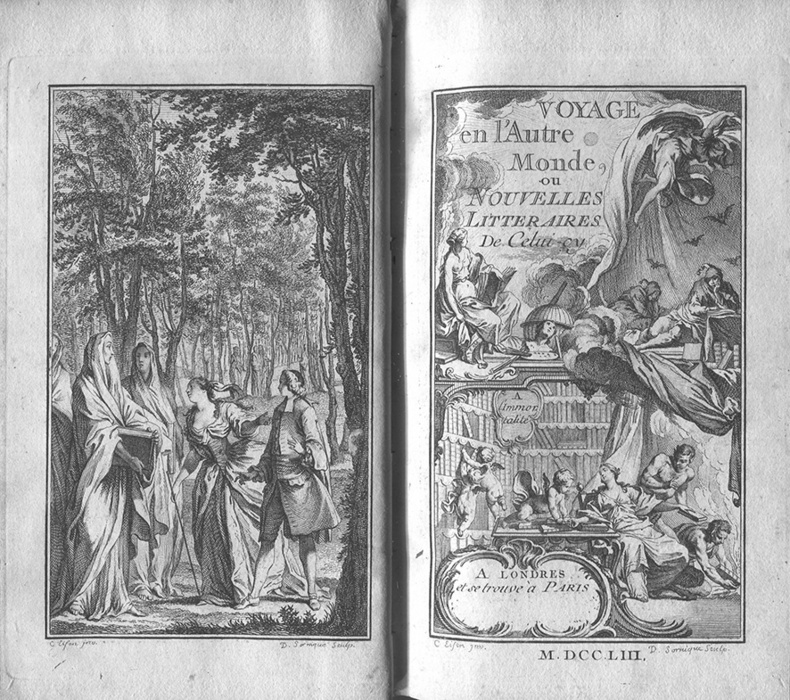 Frontispice et page de titre gravés par EISEN. Seconde édition de cet ouvrage paru en 1749 sous le titre “Voyage au Sèjour des Ombres”