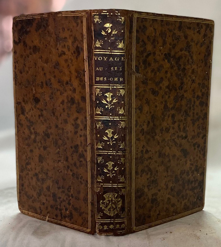 1751 deux tomes reliés en un volume, reliure plein veau havane raciné (binding full calfskin) reliure in-octavo, dos long (spine without raised band) décoré or (gilt decoration) filets or (gilt line) - compartiments à fleuron au fer plein (floweret with full blocking stamp) - titre frappé or (gilt title) - - pièce de titre sur fond bordeaux (label of title) avec filet or (label of title with gilt line), coiffe supérieure trés légèrement manquante (head of the spine lightly faded), manque de dorure (blurred gilding) en haut du dos, plats décorés d'un fillet d'encadrement à froid (cover blind-stamping) - légères épidermures ( cover with lights scratches), filet sur les coupes (gilt line on the cuts), manque de dorure (blurred gilding), toutes tranches peignées (all painting edges) rouges et bleues, marque-page en tissu (bookmark in tissue), orné d'un frontispice hors-texte (full page engraving) et d'une gravure titre (full page engraving) en noir par EISEN (Le titre gravé porte : "Voyage en l'autre monde, ou Nouvelles littéraires de celui-cy" ; et l'adresse : "Londres ; et Paris, 1753", 215+216 pages, 1751 A La Haye et A Paris sans nom d'éditeur (L'adresse de La Haye est fausse ; imprimé en France, d'après le matériel typogaphique, vraisemblablement à Paris). .