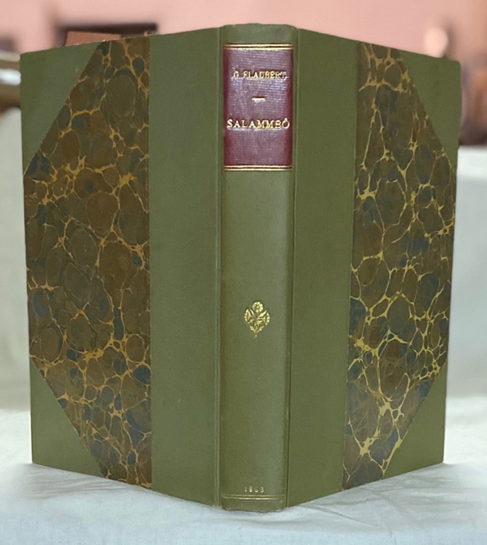 Titre : Salammbô. Œuvres de Gustave Flaubert – Tome premier et Tome second (complet en 2 volumes) Auteur : Gustave Flaubert Éditeur : Alphonse Lemerre, Éditeur Lieu : Paris, 23-33, Passage Choiseul Date : s. d. [vers 1890–1900] Format : 2 volumes in‑12 (env. 18 x 12 cm) Reliure : Demi‑basane brune d’époque, dos à faux-nerfs ornés de filets et fleurons dorés, titres « G. Flaubert — Salammbô I / II » ; plats marbrés. Signet en tissu vert conservé dans le tome II. État du livre : Bon état général. Frottements et petites épidermures aux dos, coins et coiffes émoussés, dos légèrement passés ; plats marbrés avec marques d’usage. Intérieurs propres, papier uniformément jauni avec rares rousseurs éparses, sans annotations ni manques. Reliures solides. Ensemble homogène et complet des deux tomes. Contenu / remarque : Belle édition Lemerre des Œuvres de Flaubert, non illustrée, présentant le célèbre roman historique situé à Carthage après la Première Guerre punique. Page de titre en rouge et noir avec la marque de l’éditeur. Langue : Français
