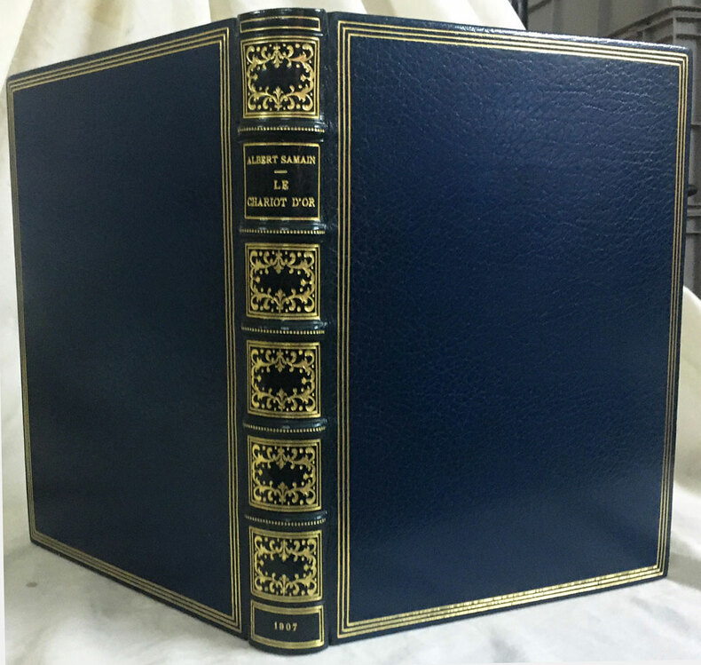 P. Ferroud 1907.In-4° plein maroquin bleu, dos à nerfs richement orné de motifs floraux et filets dorés, plat encadrés d'un triple filet doré, tranches dorées, couverture conservée, étui bordé. Reliure signée CANAPE.