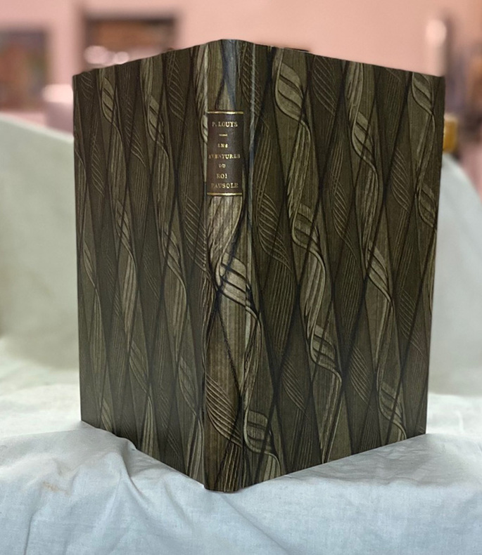 illustrations de Mariette Lydis roman de l'écrivain français Pierre Louys, publié en 1901. Le livre est souvent classé comme un conte libertin et fantastique, dans lequel Pierre Lou s explore des thèmes de désir, de sensualité, et d'aventure. L'histoire se déroule dans le royaume fictif de Tryphème, dont le roi s'appelle Pausole. Le roi Pausole est un personnage original et extravagant. Il vit dans un harem composé de 366 femmes, une pour chaque jour de l'année, et observe un jour de célibat le 29 février, année bissextile. Le roi Pausole est un monarque libéral qui valorise la liberté sexuelle et les plaisirs de la chair. L'intrigue tourne autour des aventures du roi Pausole qui, cherchant à satisfaire sa curiosité, décide de se déguiser en mendiant pour explorer son royaume incognito. Au cours de ses voyages, il se retrouve impliqué dans diverses péripéties, rencontrant des personnages excentriques et vivant des aventures inattendues. Tout au long du récit, Pierre Lou s dépeint des scènes érotiques et libertines, faisant de ce roman une œuvre controversée pour son époque. "Les Aventures du Roi Pausole" a été l'une des œuvres les plus célèbres de Pierre Lou s, contribuant à sa notoriété en tant qu'écrivain avant-gardiste de la Belle Époque. Son style littéraire, son audace et sa représentation franche de la sexualité ont suscité à la fois l'admiration et la critique, et l'œuvre continue d'être étudiée et discutée dans le contexte de la littérature érotique et libertine du début du XXe siècle. vol relié, 230x180, superbe reliure demi cuir à coins, tranche de tête dorée, légères rousseurs sur qq pages, très bel état intérieur, 340pp exemplaire numéroté sur vélin chiffon, 3951 Union Latine d'Edition 1934
