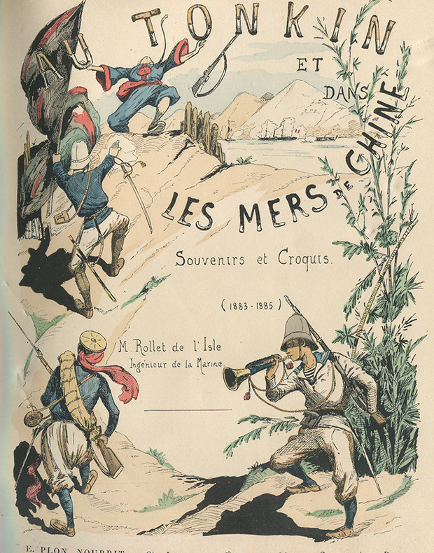 Paris E. Plon, Nourrit et Cie, imprimeurs-éditeurs 1886 in 8 (24,5x19) 1 volume reliure pleine percaline bleue ornée de l'éditeur, dos et plat supérieur titrés en lettres dorées, avec un fer doré à l'ancre et au dragon mêlés sur le plat supérieur,.faux-titre, page de titre illustrée coloriées, 338 pages [2], avec de nombreuses illustrations dont certaines coloriées, 27 illustrations à pleine page dont 9 en couleurs. Charles-Maurice Rollet de L'Isle, 1859-1943. Edition originale. Bel exemplaire, intérieur très frais