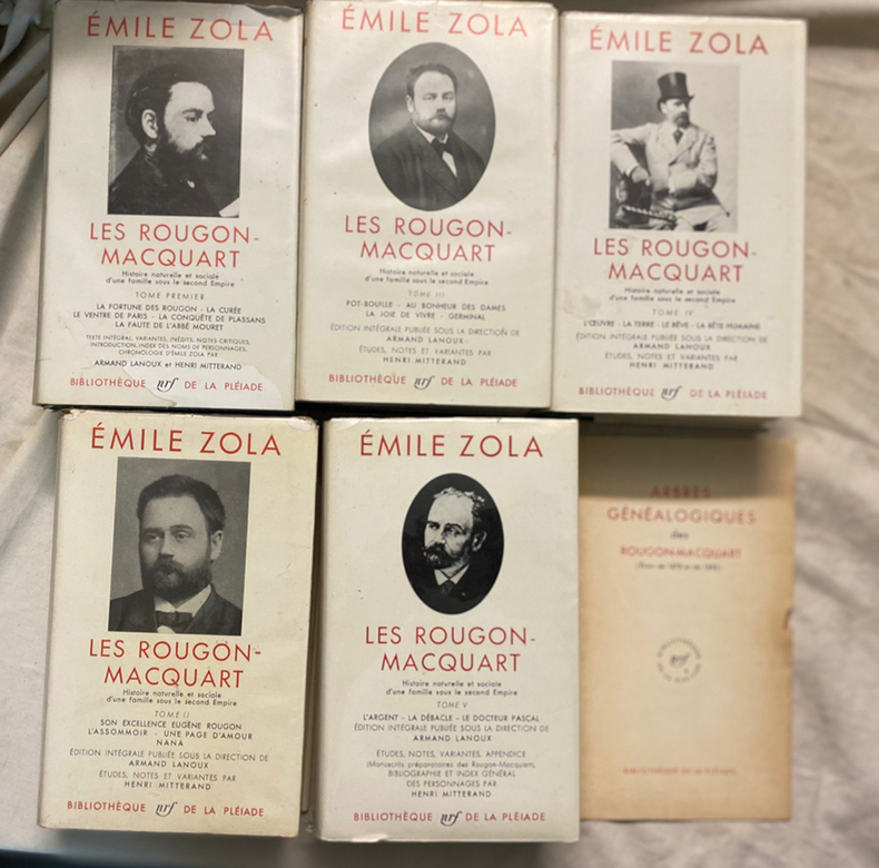 Gallimard Bibliothèque de la Pléiade Relié 1976 5 volumes in-12 (11 x 18 cm) reliés pleine peau sous demi-jaquettes, rhodoïds et emboîtage carton muet (pour le tome III seulement), tête verte, bien complet des cinq volumes qui constituent l'intégralité des Rougon-Macquart, texte intégral établi, annoté et présenté par Armand Lanoux et Henri Mitterand, ; très menus défauts sur les rhodoïds, bien complet du livret contenant les arbres généalogiques des Rougon-Macquart, tranches un peu jaunies, bel ensemble. Livraison a domicile (La Poste) ou en Mondial Relay sur simple demande.