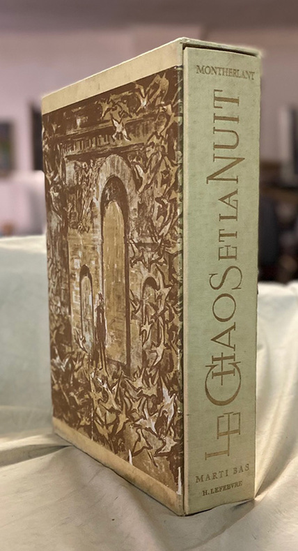 Paris Editions Lidis / Imprimerie Nationale 1963 in folio (28,5x22) 8 volumes brochés, couvertures rempliées, 248, 183, 227, 177, 209, 349, 385 et 218 pages; chemises et étuis de l'éditeur (dos de cuir rouge ornés d'un semis d'étoiles dorées). Ouvrages ornés de nombreuses lithographies originales en couleurs de Clairin, Bardone, Spitzer (2), Trémois, Zendel, Montané (2). Tome 1: Le songe, 8 lithographies originales en couleurs de Pierre-Eugène Clairin (dont 1 sur double page), 248 pages. Tome 2: Les olympiques, 6 lithographies originales en couleurs de Guy Bardone (dont 1 double page), 183 pages. Tome 3: Les bestiaires, 8 lithographies originales en couleurs de Walter Spitzer (dont 1 double page), 227 pages. Tome 4: La petite infante de Castille - Encore un instant de bonheur, 6 lithographies originales en couleurs de Pierre-Yves Trémois (dont 1 double page), 177 pages. Tome 5: Les célibataires, 8 lithographies originales en couleurs de Gabriel Zendel (dont 1double page), 209 pages. Tome 6: Les jeunes filles - Pitié pour les femmes, 10 lithographies originales en couleurs de Roger Montané (dont 2 doubles pages), 349 pages. Tome 7: Le démon du bien - Les lépreuses, 12 lithographies originales en couleurs par Roger Montané (dont 2 doubles pages), 385 pages. Tome 8 : Le chaos et la nuit, 8 lithographies originales en couleurs par Walter Spitzer (dont 1 double page), 218 pages. Tirage limité, celui-ci un des 3500 exemplaires numérotés sur vélin Vercors filigrané à la signature de Henry de Montherlant. Ensemble en très bel état ( Photographies sur demande / We can send pictures of this book on simple request )