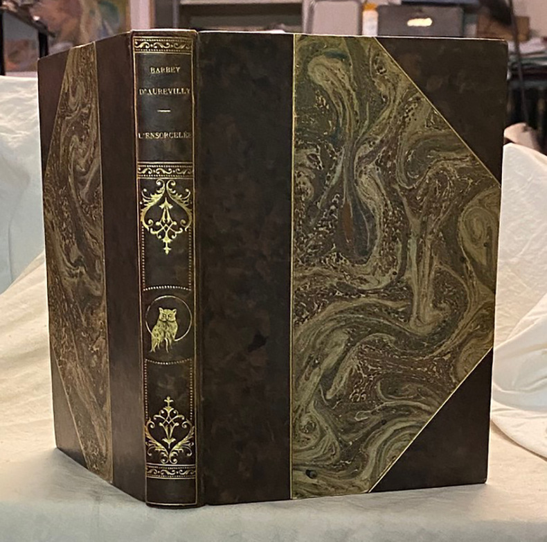 Exemplaire revêtu d'une délicieuse reliure de plein maroquin. Il s'ouvre sur un portrait-frontispice figurant Barbey par Rajon et recèle en outre 6 délicates eaux-fortes par Félix Buhot. ''Du point de vue pictural, le meilleur de l'oeuvre de Buhot réside dans les délicates illustrations qu'il exécuta pour quelques romans de Barbey d'Aurevilly, et notamment pour L'Ensorcelée, le Diable amoureux de Cazotte aussi, ainsi que les Lettres de mon moulin de Daudet. Comme graveur, il s'est particulièrement fait remarquer par l'expression intense de ses estampes et sa science approfondie des effets de lumière et d'ombre''. (in Bénézit). ''Au rang des oeuvres de Buhot les plus dignes d'intérêt, figurent ces esquisses, demeurées à l'état d'ébauches, destinées ou non à servir de modèles à d'éventuelles gravures''. (in Centorame). ''Dans une atmosphère de campagne barbare où interviennent des pâtres jeteurs de sorts et des vieilles femmes hantées par le souvenir de leurs débauches, Jeanne Le Hardouey, une aristocrate claudélienne mésalliée d'âme et de corps à un acquéreur de biens nationaux, est «ensorcelée» par un prêtre, l'abbé de La Croix-Jugan qui a tenté de se suicider par désespoir de la cause perdue et dont le visage monstrueux porte la trace des tortures que lui ont fait subir les Bleus. «J'ai tâché, disait Barbey, de faire du Shakespeare dans un fossé du Contentin.» Centorame, Les Illustrateurs de l'oeuvre de Barbey, p. 48 - Séguin, Barbey / Etude de bibliographie critique, p. 42 - Boucard & Goodfriend, p. 45 et suivantes - Bénézit II, Dictionnaire des peintres, p. 385 - Monod I, Manuel de l'amateur de livres illustrés modernes, 957 (pour une édition antérieure). Dos légèrement tâcheté. Très rares autant que claires rousseurs dans le corps d'ouvrage. Nonobstant, belle condition.