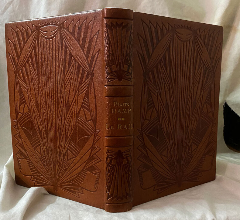 L'exemplaire de la bibliothèque de René Kieffer. 18e volume de la collection « L'amour des livres ». Un des 50 exemplaires sur Japon impérial, celui-ci le n°3. Suivent 1000 exemplaires sur vélin de cuve. L'ouvrage est truffé du contrat souscrit avec Gallimard pour les droits sur l'ouvrage. Seule « collection » jamais proposée par les éditions René Kieffer, « L'amour des livres » comprend 20 volumes, parus entre 1924 et 1929. Les ouvrages qui la composent se ressemblent plus par la maquette que par le texte : auteurs contemporains y côtoient Stendhal ou Pouchkine. En outre, « L'amour des livres » détonne du reste de la production des éditions Kieffer en ce que l'illustration se limite à quelques ornements en début et fin de chapitres ou à un encadrement du texte. Présentés comme des éditions « demi-luxe », les ouvrages de la collection sont vendus à des prix plus bas que le reste des productions Kieffer. Le coût des exemplaires sur vélin tourne autour de cinquante francs, celui des exemplaires sur Japon autour de cent francs ; cela n'empêche pas le critique Clément-Janin de louer la prestation de l'éditeur : « Cette collection est intéressante et comme texte et comme présentation. La typographie y est maîtresse. Le décor lui est subordonné, ce qui est une bonne discipline ». Les couvertures arborent des motifs simples, géométriques ou emblématiques. Kieffer semble avoir proposé pour la collection deux reliures éditeurs ornées à la plaque : la présente en cuir arborant un décor de faisceaux sur les plats et le dos, et une seconde en cartonnage papier à décor d'emblèmes : coeurs, livres, étoiles, etc. Sanjuan 85