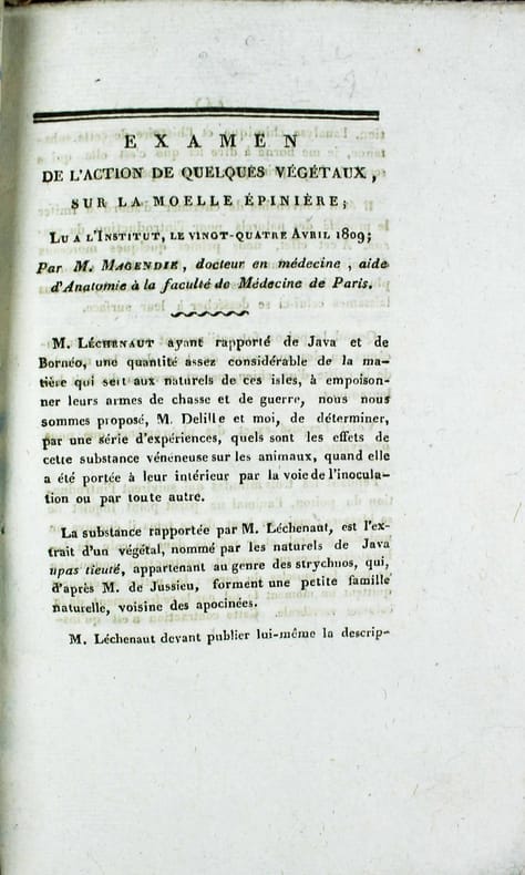 Première édition. Expériences faites par Magendie and Raffeneau-Delile à partir de l'extrait d'un végétal nommé à Java, upas tieuté, de la noix vomitive et de la fève de Saint-Ignace. Tiré à part du 'Nouveau bulletin scientifique de la Société philomatique'. DSB 9, 8 : "In a series of ingenious experiments on various animals, [Magendie and Raffeneau-Delile] studied the toxic action of several drugs of vegetable origin, particulary of upas, nux vomica, and St-Ignatius' s bean. As Olmsted observes, theses experiments mark the beginning of modern pharmacology." Bon exemplaire. /// In-8 de 22 pp. Broché, couverture muette de l'époque. ////