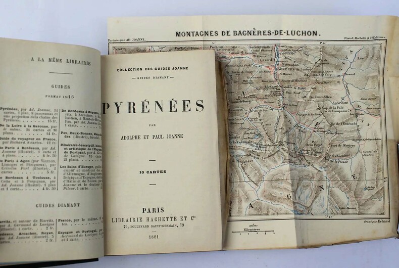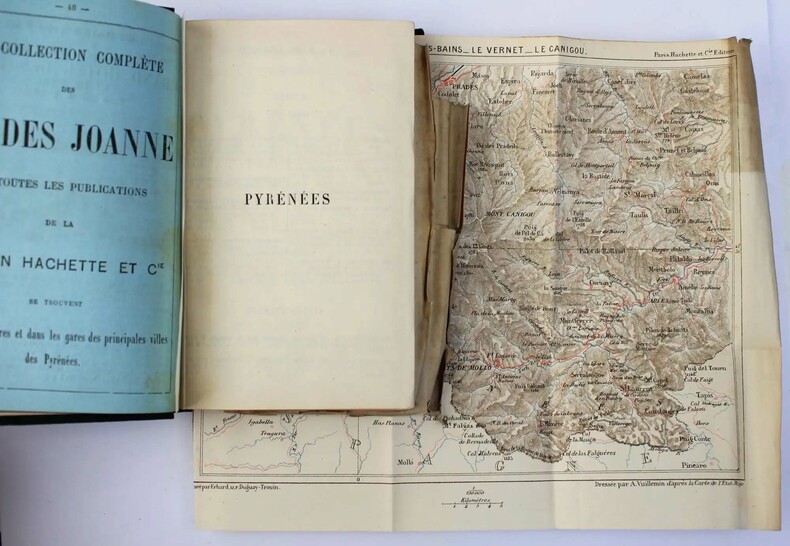 Illustré par 10 cartes dépliantes : - Vue d'ensemble des Pyrénées. - Bayonne, Biarritz et Cambo. - Les Eaux-Bonnes, les Eaux-Chaudes, Cauterets. - St-Sauveur, Barèges, Bagnères-de-Bigorre. - Le Mont-Perdu et le massif calcaire. - Chemin de fer de Montréjeau à Bagnères-de-Luchon. - Montagnes de Bagnères-de-Luchon. - Montagnes de Vénasque. - De Foix à Puycerda. - Le Vernet, Amélies-les-Bains, le Canigou. Précédé de 40 pages de publicité et suivi de 84 autres pages de publicité. Bel exemplaire. /// In-12 de XXXV, (1), 412 pp., 10 planches h.-t. Toile verte de l'éditeur, titre doré sur le premier plat, tranches rouges. (Reliure de l'époque.) ////