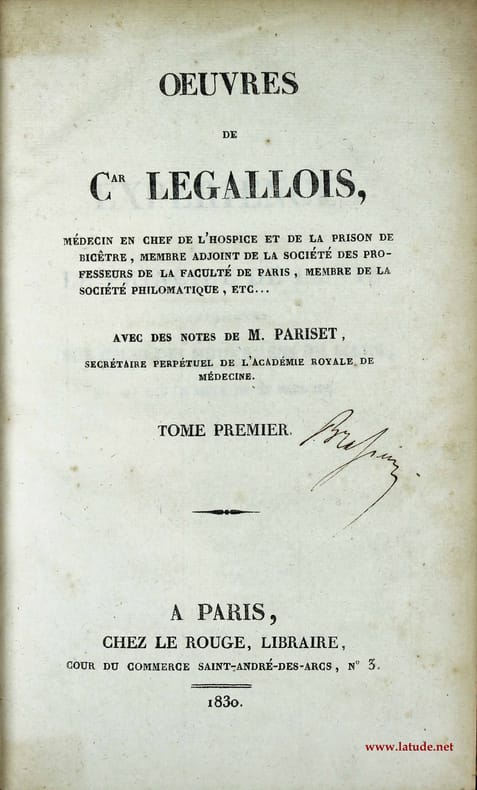 Première édition de ces oeuvres. Elles contiennent une notice biographique, "Expériences sur le principe de la vie", son ouvrage le plus célèbre et ses divers mémoires dont "Le sang est-il identique dans tous les vaisseaux qu'il parcourt." Legallois a prouvé que la section bi-latérale du vague peut déterminer une broncho-pneumonie et a réussi à localiser le centre respiratoire dans la moelle épinière. Papier très légèrement bruni. /// 2 volumes in-8 de (8), 402 pp. / (4), 362, (2) pp., 1 tabl. h.-t. Demi-basane brune, dos orné de fleurons et filets dorés, tranches marbrées. (Reliure de l'époque.) //// /// PLUS DE PHOTOS SUR WWW.LATUDE.NET