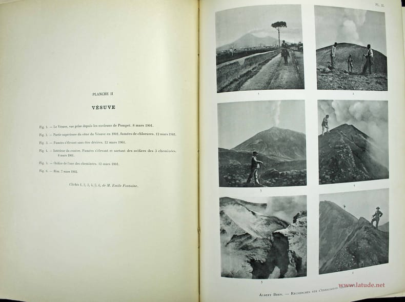 Première édition. "Ce livre est écrit pour les vulcanologues et les géologues. Ce n'est pas un exposé descriptif, mais un recueil de données numériques et d'observations précises, concernant les phénomènes physiques et chimiques qui se passent dans la couche de terrain du volcan la plus rapprochée de la surface terrestre." Illustré par 34 planches de photos (Santorin, Vésuve, Stromboli, Canaries, Java, Kratakau, archipel des Sandwich...) Cachets de bibliothèque. Plats légèrement frottés. Bon exemplaire. /// Petit in-folio de 277, (3) pp., 34 planches h.-t., (34) ff. Cartonnage, couvertures imprimées collées sur les plats et le dos qui est en toile. (Reliure de l'époque.) ////
