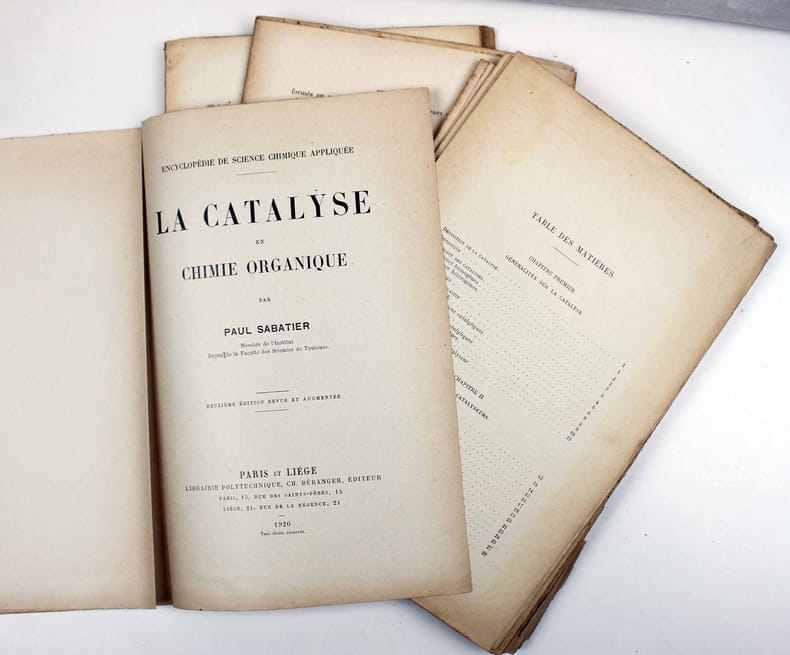 Paris et Liège Librairie Polytechnique Ch. Béranger 1913 in 8 (24,5x16,5) 1 volume reliure pleine percaline brique de l'éditeur, XIII et 255 pages. Généralités sur la catalyse; Matiéres diverses pouvant produire la catalyse; Oxydations; Introductions diverses dans les molécules; Hydrogénations; Isomérisations, polymérisations, condensations par addition; Séparations diverses; Déshydrogénations; Déshydratations; Séparation d'hydracide ou de molécules similaires; Dédoublement des acides; Dédoublement des éthers sels d'acides organiques; Mécanisme de la catalyse. Première édition. Encyclopédie de Sciences chimiques appliquée aux arts industriels, Tome 3. Paul Sabatier, Membre de l'Institut, Doyen de la Faculté des Sciences de Toulouse. Bel exemplaire ( Photographies sur demande / We can send pictures of this book on simple request )