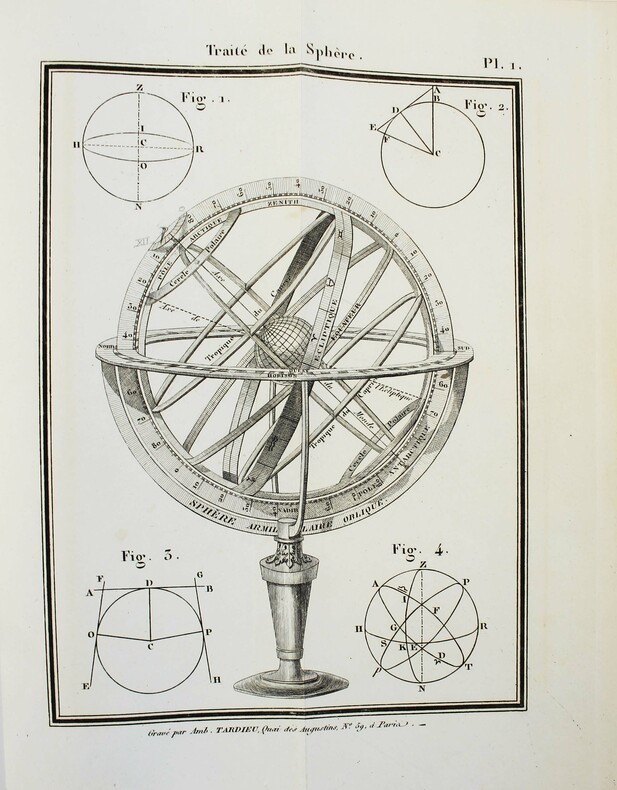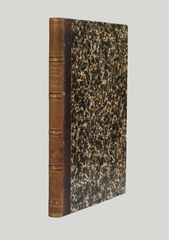 Bachelier Paris 1837 In-8 ( 215 X 135 mm ) de 268 pages, demi basane à coins, dos à nerfs orné de filets dorés. Huitième édition, revue et augmentée par PUISSANT. A la fin, table de concordance des calendriers grégorien et républicain. 1 tableau et 3 planches dépliantes. Rousseurs sans gravité, bon exemplaire.Etude sur le Calendrier.Calendrier et Sphère.Synopsis:TRAITÉ DE LA SPHERE : de la sphère armillaire et des cercles les plus usités dans l'astronomie de l'horizon rationel et de l'horizon sensible du méridien de l'eclipse et du zodiaque ainsi que du mouvement prpre du soleil nutation l'apogée et le périgée du mouvement progressif des étoiles année tropique et année sidérale l'année anomalistique des colures des tropiques points cardinaux distance zénithale et hauteur méridienne des cercles de la sphère que l'on imagine sur le globe terrestre et des différentes apparences que l'on y remarque en divers lieux des apparences de la sphère droite des apparences de la sphère oblique des apparences de la sphère parallèle du mouvement et des apparences de la lune lumière cendrée de la lune mouvement diurne des fixes comparé à celui du soleil: manière de régler une pendule du temps moyen et de l'équation du temps exposition abrégé du système planétaire inégalités séculaires des comètes. Problèmes sur la sphère qui ne supposent que la trigonométrie rectiligne des nouvelles mesures décimales déduites de la grandeur du méridien terrestre le mètre. Trigonométrie sphèrique.TRAITÉ DU CALENDRIER : des jours et des mois calendrier romain de l'année du cycle solaire des lettres dominicales du cycle lunaire et des nombres d'or de l'indiction des périodes victorienne et julienne de la réformation du calendrier en 1582 de la métemptose ou équation solaire et de la proemptose ou équation lunaire des épactes calendrier grégorien table des épactes méthode pour trouver le jour de Pâques et l'âge de la lune calendrier pour les épactes des pleines lunes du calendrier français révolutionnaire.