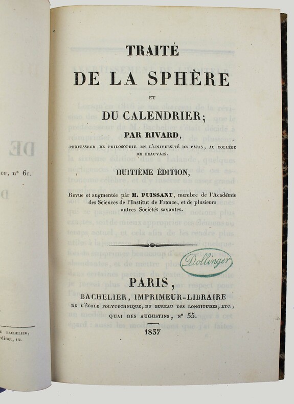 Paris, à la Librairie économique, An XII - 1804, in-8, 265 pp, 1 tabl. depl, 3 pl, Basane tabac de l'époque, dos lisse et fleuronné, pièce de titre rouge, Trois planches dépliantes gravées sur cuivre dont l'une représente la sphère armillaire. Un tableau dépliant des épactes des nouvelles et pleines lunes pour les années 1700 à 2700. Sixième édition, revue par le célèbre astronome Joseph Jérôme de Lalande (1732-1807), des traités parus en 1741 et 1743. Dominique-François Rivard (1697-1778), "respectable" et "très-bienfaisant" professeur, enseigna de nombreuses années la philosophie au collège de Beauvais. Ses travaux, jugés "très utiles" par de Lalande, ont été réédités par ses soins en 1798 (5e édition). Cette édition-ci est conforme à la précédente, avec de nombreuses corrections dans la table des villes et l'ajout d'un article sur l'équation du temps (De Lalande, avertissement pp. 3-4). Étiquette ex-libris J[oseph] Laissus (1900-1969), directeur-fondateur de l'École technique supérieure du Laboratoire. Épidermures, coins usés. Bon état intérieur. Couverture rigide