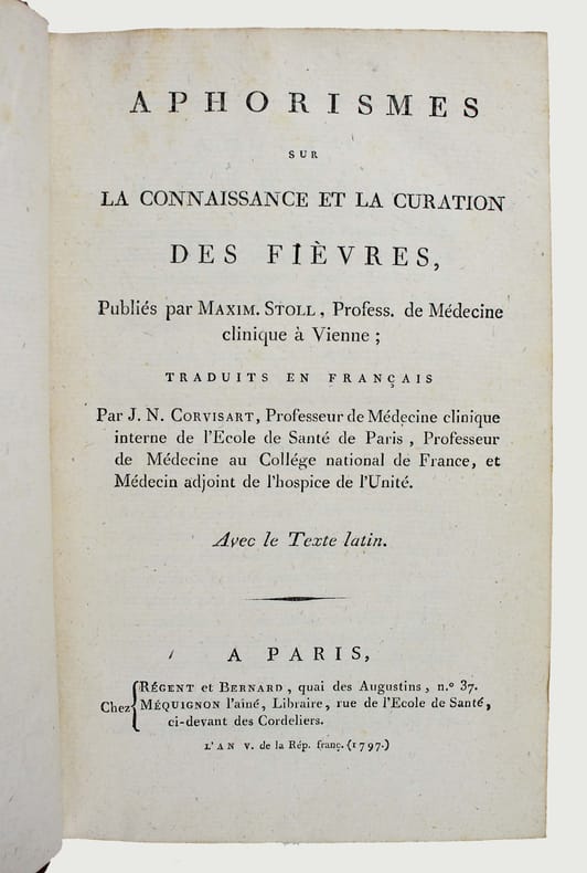 Première édition de la traduction de Corvisart. Elle se trouve en regard du texte latin. Infime accroc à la coiffe. Bel exemplaire. /// In-8 de XX, 581, (1) pp. Demi-basane marbré, dos orné, étiquette verte, tranches jaunes. (Reliure de l'époque.) ////