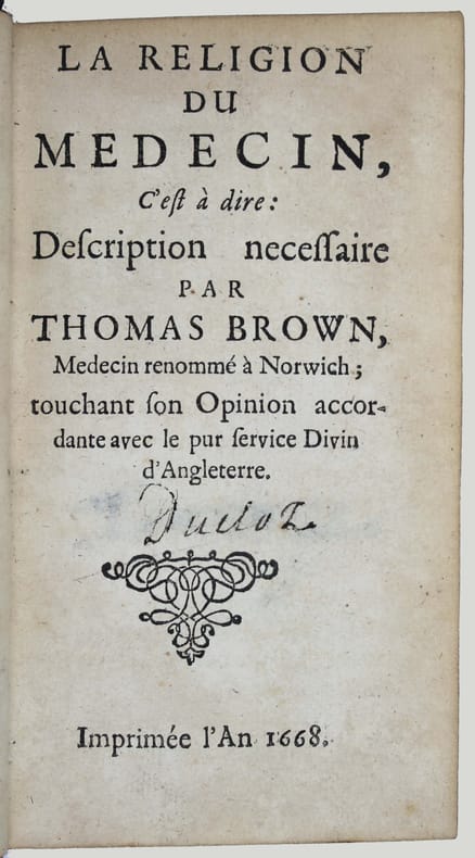 [Amsterdam, J. Blaeu ?], 1668, in-12, (12)-360-(2) pp, frontispice gravé, Basane du XVIIIe s, dos à nerfs, pièce de titre en maroquin havane, tranches rouges, Première édition française de cet ouvrage qui parut, en 1642, sous le titre Religio Medici, et qui fut dès 1644 traduit en latin. L'édition latine fut souvent réimprimée, accompagnée d'annotations et commentaires explicatifs. L'ouvrage, dans sa version latine, fut mis à l'index des livres interdits par décret du 18 mars 1645. Le traducteur français, Nicolas Lefèvre (ou Le Febvre), né vers 1610, professeur de chimie au Jardin des Plantes de Paris, suit la version latine du texte. Cette traduction date de son séjour en Angleterre lorsqu'il fut appelé par Charles II, qui lui confia en 1664 la direction de la pharmacie du palais Saint James. Membre de la Société royale de Londres, Lefèvre meurt en 1674. La formulation générale du titre, "la religion du médecin", ne témoigne pas du contenu du livre. Il s'agit d'une oeuvre toute personnelle, où, d'une part, Browne, se défend contres les accusations pour athéisme et développe son approche singulière du fait religieux ; et où, d'autre part, il égrène ses avis sur de nombreux sujets du temps. "La religion du médecin aurait tout aussi bien pu s'intituler, au dire de Bayle, Le médecin de la religion. Thomas Browne affirme sa foi chrétienne, mais ne veut dépendre d'aucune église". Ainsi, en 55 chapitres courts, dans un style alliant préceptes et paradoxes, moral et ironie, Browne étudie, tout en s'y impliquant et en affirmant son opinion, les fondements de la religion et de la morale, la magie, les esprits, les démons, les apparitions, les songes, la pierre philosophale, les pauvres, le mariage, la musique, etc. Browne pratiqua la médecine à Norwich . Il est considéré comme l'un des plus grands auteurs du XVIIIe siècle et comme l'un les plus singuliers. Ex-libris manuscrit ancien : "Moisson". Dos restauré. Certains titres courants rognés, sinon bel exemplaire. Biblioteca esotherica n° 520. PMM n° 131 pour l'édition originale londonienne. Anne Sauvy, Livres saisis à Paris entre 1678 et 1701, n° 1018. Brunet 1, 1281. Caillet 1717. Keynes, 71. Willems, 1784. Couverture rigide