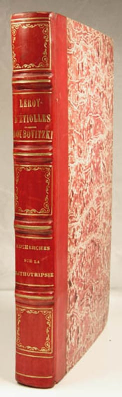 Première édition. Compte-rendu de "la lutte au sein de l'Académie entre l'ancienne chirurgie en faveur de la taille et la chirurgie moderne en faveur de la lithotritie." Velpeau était partisan de la taille. L'auteur rapporte tout ce qu'il y d'important sur ces deux opérations. Très rare : un seul exemplaire conservé dans les bibliothèques publiques en France (BNF). Relié à la suite : - LEROY D'ETIOLLES. Histoire de la lithotritie, précédée de réflexions sur la dissolution des calculs urinaires. Paris, Baillière, 1839. In-8 de (4), L, (2), 168 pp. Première édition, rare. Un des meilleurs spécialistes de son époque en urologie, Leroy d'Etiolles est l'inventeur d'un instrument, pour extraire ou briser les pierres dans la vessie en passant par l'urètre. Cette histoire est illustrée de 65 gravures dans le texte d'instruments de chirurgie. Très bel exemplaire, bien relié. /// In-8 de (4), VI, 246 pp. Demi-veau rouge, dos à nerfs orné. (Reliure de l'époque.) //// Bound with : - LEROY D'ETIOLLES. Histoire de la lithotritie. 1839. First editions of these two texts on urology, in a very beautiful binding.