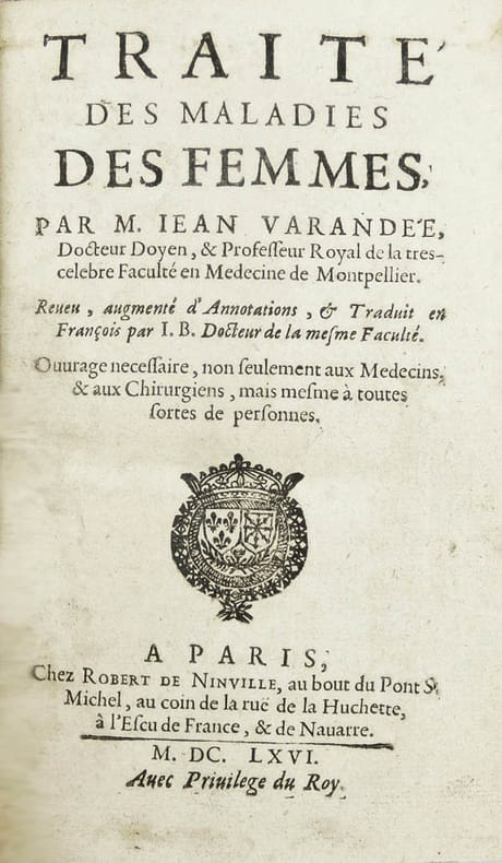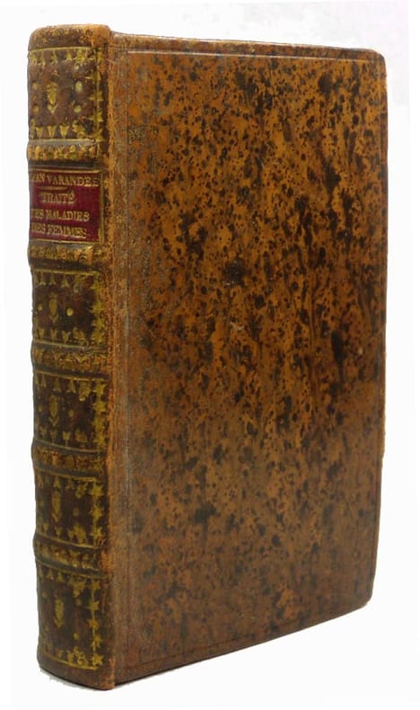 Publié pour la première fois, en latin, à Montpellier en 1620. Varanda est le premier à décrire la chlorose des jeunes filles, qu'il nomme (p. 2) "chlorosis ou pasles-couleurs. "Divisé en trois livres : Le 1er traite des maladies propres aux femmes. Le 2e de la stérilité, des signes de la grossesse, de l'accouchement... Le 3e, de l'allaitement, des mamelles, du lait... Jean de Varandé (ou Varandal ou Varanda) (Nimes, 1564-1617) fut nommé doyen de la Faculté de Montpellier en 1609. "Il composa plusieurs traités mieux écrits que ceux qui avaient paru avant lui, et débarrassés de ce tas de recettes frivoles, ainsi que de cette quantité de remèdes inutiles, dont les ouvrages des sectateurs des arabes avaient été surchargés jusqu'alors. Il n'en publia cependant aucun. ... Mais on s'empressa de les faire imprimer après sa mort, et c'est à ses écoliers qu'on en doit les éditions." (Bayle et Tillaye). Bon exemplaire. /// In-8 de (16), 620, (12) pp. Basane marbrée, dos à nerfs orné, tranches rouges. (Reliure du XIXe.) //// The first edition was published in Latin in Montpellier in 1620. Varandal was the first to descrbe chlorosis in young girls. Divided into three books: The first deals with diseases specific to women. The second of sterility, signs of pregnancy, childbirth ... The third, of breastfeeding, breasts, milk ... Jean de Varanda (or Varanda or Varandé) (Nimes, 1564-1617 ) was dean of the Faculty of Montpellier in 1609. This a posthumous book, as all his books. /// PLUS DE PHOTOS SUR WWW.LATUDE.NET