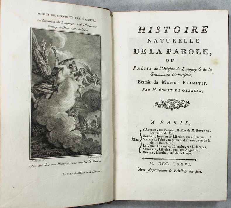 A Paris, Chez l'auteur, Boudet, Valleyre, Vve Duchesne, Saugrain, Ruault, 1776, in-8, demi-basane brune et papier à la colle, dos lisse à faux-nerfs filetés dorés, titre doré. Faux-titre, frontispice gravé par A. L. Romanet d’après C. P. Marillier « Mercure conduit par l'Amour, ou Invention du Langage et de l'Ecriture. », Page de titre, 400 pp, 1 tableau dépliant « Alphabet Primitif, fig. 1& 2 » et 1 Planche dépliante colorée « relative aux organes de la voix, en cinq figures…dessinées d’après nature et gravées en couleurs par M. GAUTHIER DAGOTY Père», signature gravée dans la planche. Reliure avec défauts d’usage, frottements, dos légèrement passé, en partie recollé en tête, mors supérieur fendu, coiffes et coins en bon état. Corps de l’ouvrage en très bel état : belles marges, peu ou pas de rousseurs, petites salissures dans la marge sup. du frontispice, les deux planches dépliantes en parfait état & notamment la planche colorée de M. Gautier-Dagoty aux teintes éclatantes. Edition séparée, du troisième volume « Du Monde Primitif (1773- 82, 9 vol. in-4) », augmentée de la planche colorée de Gautier-Dagoty, dont l’Explication des figures fut rédigée par M. Dessault, chirurgien à Paris. Elle est considérée comme originale car elle reparue en 1816, à Paris chez Plancher, sous le nouveau titre « Histoire naturelle de la parole, ou grammaire universelle, à l'usage des jeunes gens. Nouv. édit., avec un Discours préliminaire et des Notes par M. le comte Lanjuinais.» BRUNET II-1516 ; QUERARD II-316