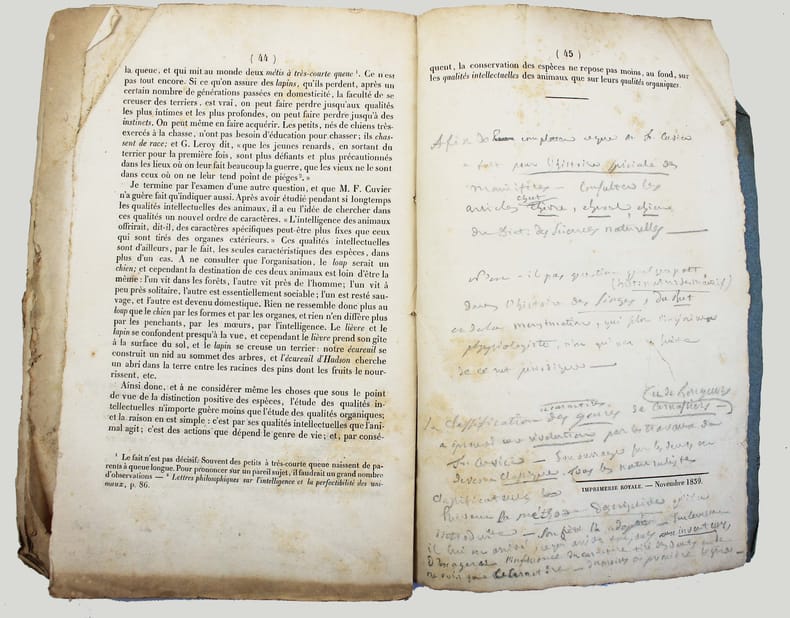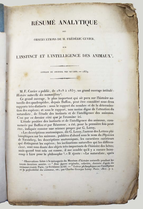 --- Les deux ouvrages sont en EDITIONS ORIGINALES ---- BEL EXEMPLAIRE ---- Eloge historique de Georges Cuvier - Analyse raisonnée des travaux de Georges Cuvier : Zoologie, Anatomie comparée, recherches sur les ossements fossiles, ostéologie comparée, application de l'anatomie comparée à l'histoire naturelle générale et philosophique, philosophie des sciences... ---- De l'instinct et de l'intelligence des animaux ; Descartes, Buffon, Réaumur, Condillac, Leroy - De l'instinct et de l'intelligence des animaux : Frédéric Cuvier - Quelques erreurs particulières redressées par Frédéric Cuvier - De la liberté ; de l'instinct et de l'habitude ; développement inverse de l'instinct et de l'intelligence dans les espèces - De la précision avec laquelle certains animaux voient dès leur naissance : opinion de Condillac, observations de Frédéric Cuvier - etc**6149/A3
